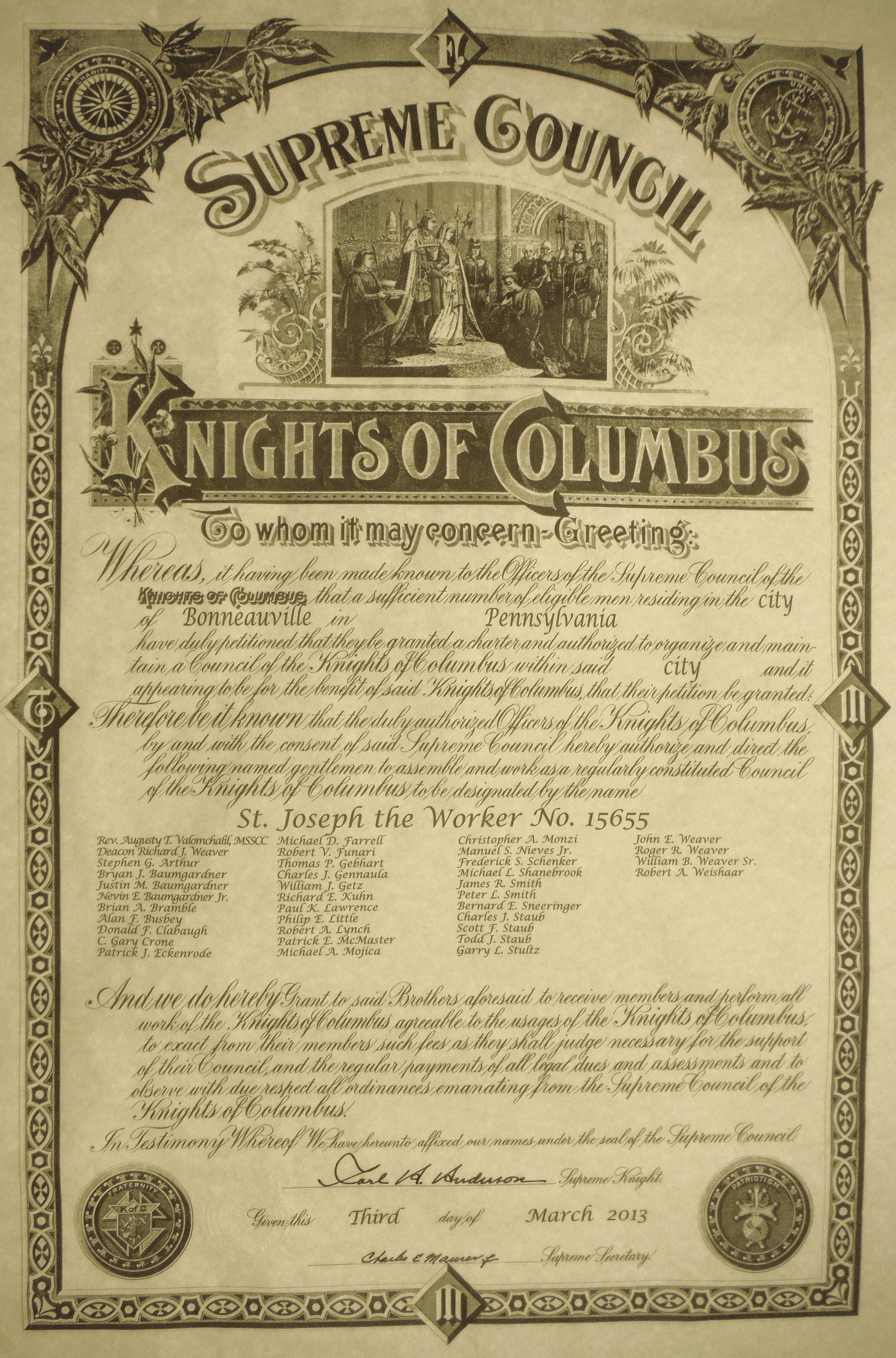 Photocopy: Supreme Council, Knights of Columbus, Bonneauville, PA. March 3, 2013. St. Joseph the Worker, No 15655. Thirty-three Charter Members are listed on the document.