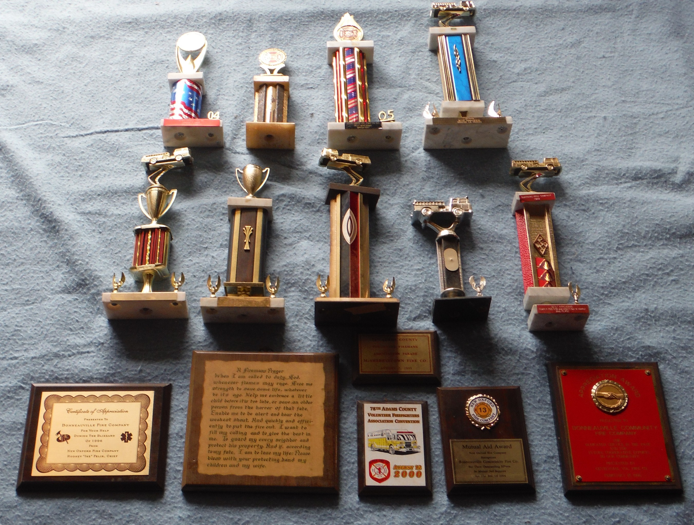 A collection of various awards given to Co. 19 for acheivments in fireman's parades.
