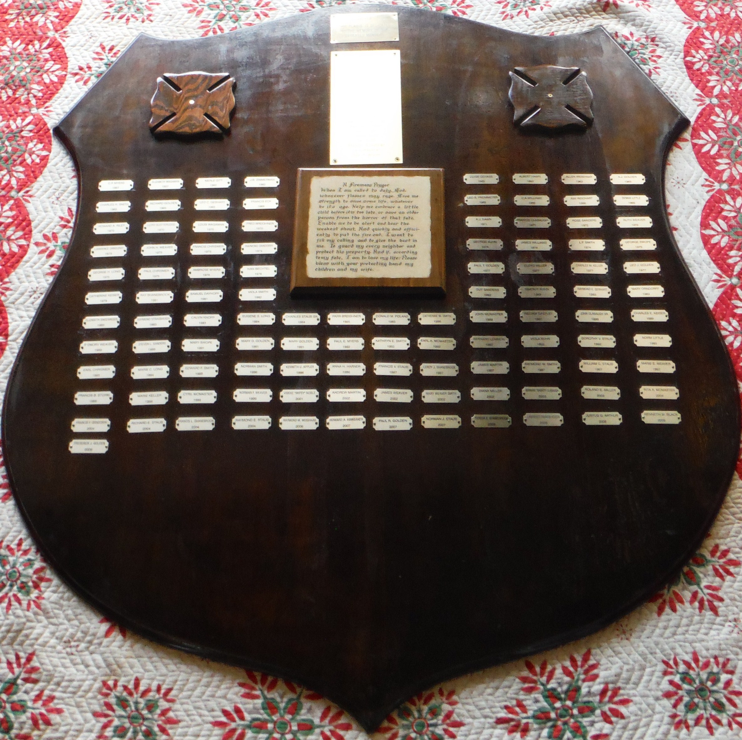 Large 48" x 56" wood plaque. Text is engraved on brass plate over aluminum except; "Fireman's prayer" is resin laminated paper on wood.