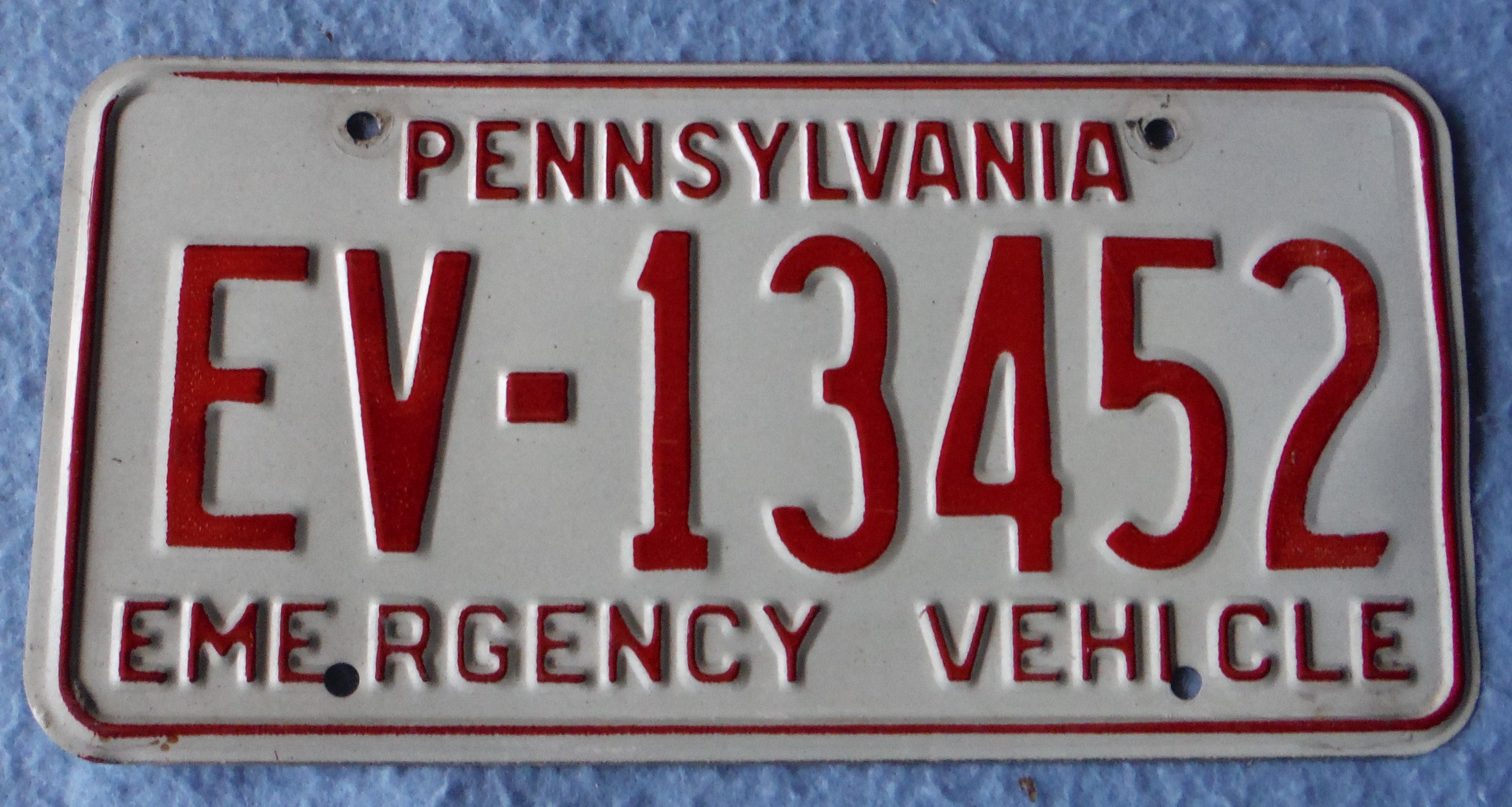 Vehicle liscense plate used on Co. 19 equipment. "Pennsylvania, EV - 13452, Emergency Vehicle."