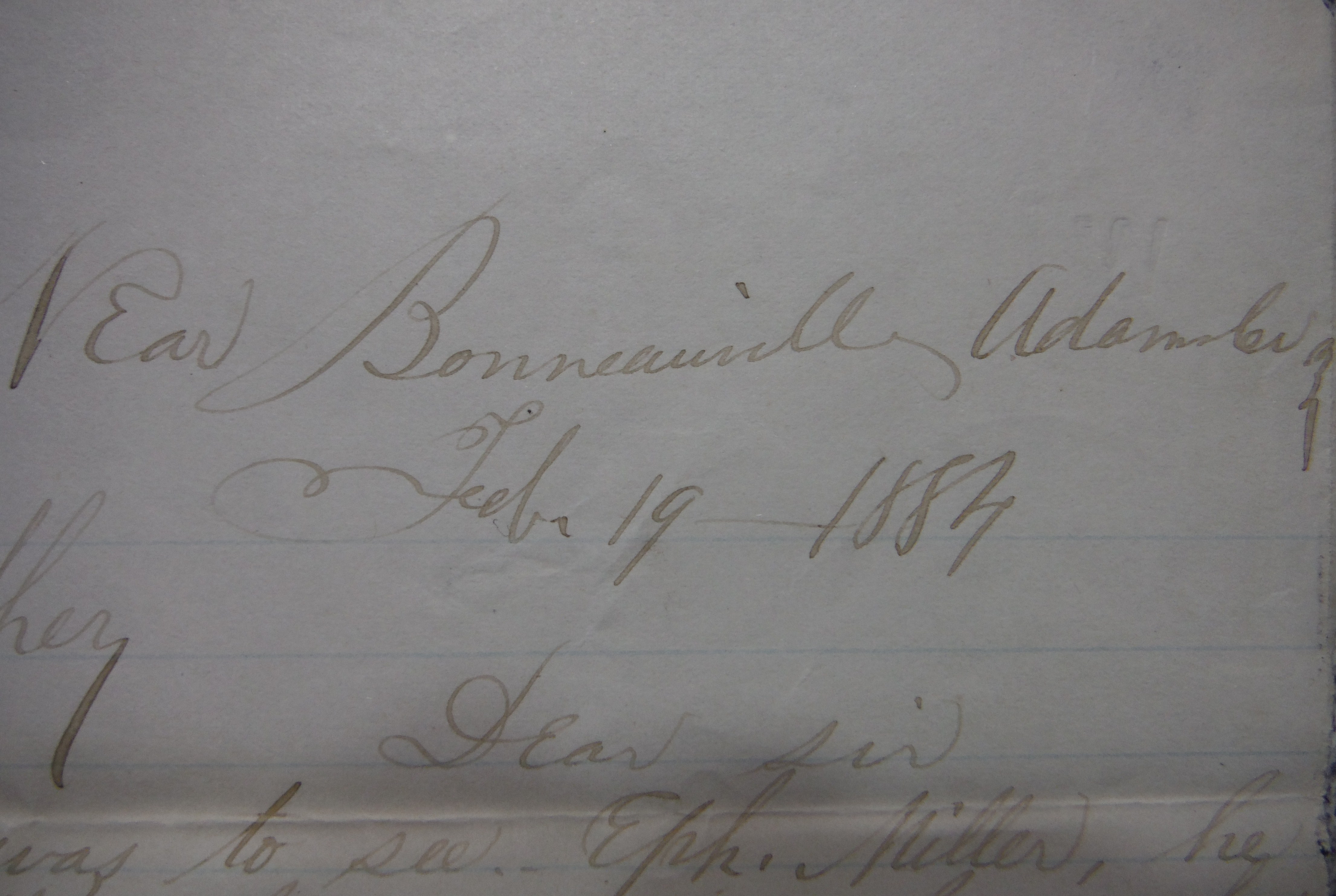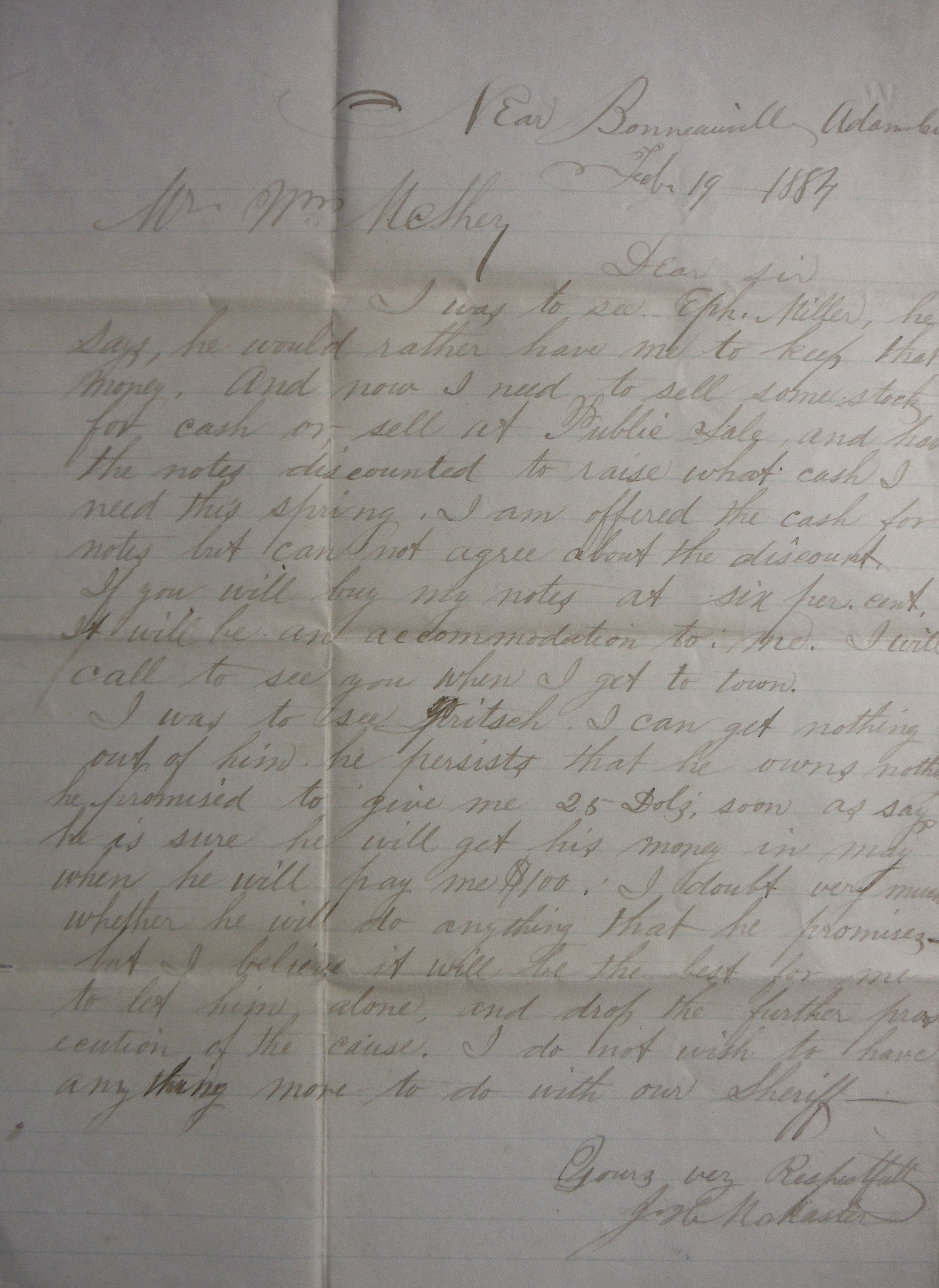 "I was to see Eph. Miller. He say that he would rather have me to keep money, and now I need to sell some stock for cash or sell at public sale, and have the notes discounted to raise what cash I need this spring. I am offered the cash for notes but can not agree about the discount. If you will but my notes at six percent It will be an accommodation to me. I will call to see you when I get to town. I was to see Pritseh (sp.?) I can get nothing out of him. He persists that he owns nothing. He promised to give me 25 dols. Soon. He is sure he will get his money in May when he will pay me $100.00. I doubt very much whether he will do anything that he promises- but I believe it will be the best for me to let him alone and drop the further prosecution of the cause. I do not wish to have anything more to do with our sheriff."