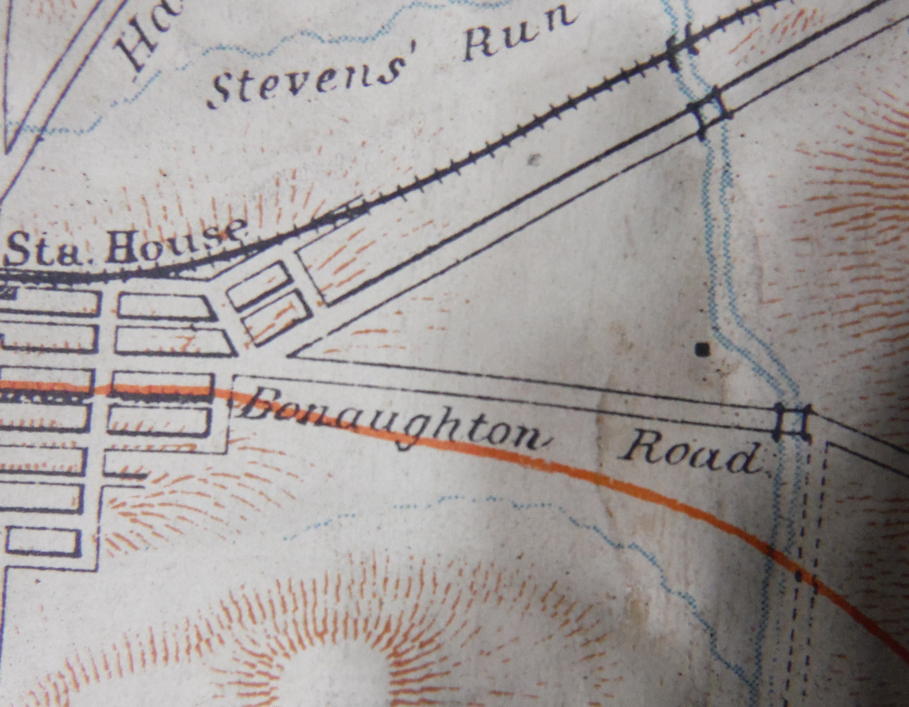 The relationship of this three-dimensional map to Bonneauville is simply the spelling of the road to the east, out of Gettysburg. Bonaughton was one spelling used during the Civil War. (Often the byway is labeled Hanover Road.)