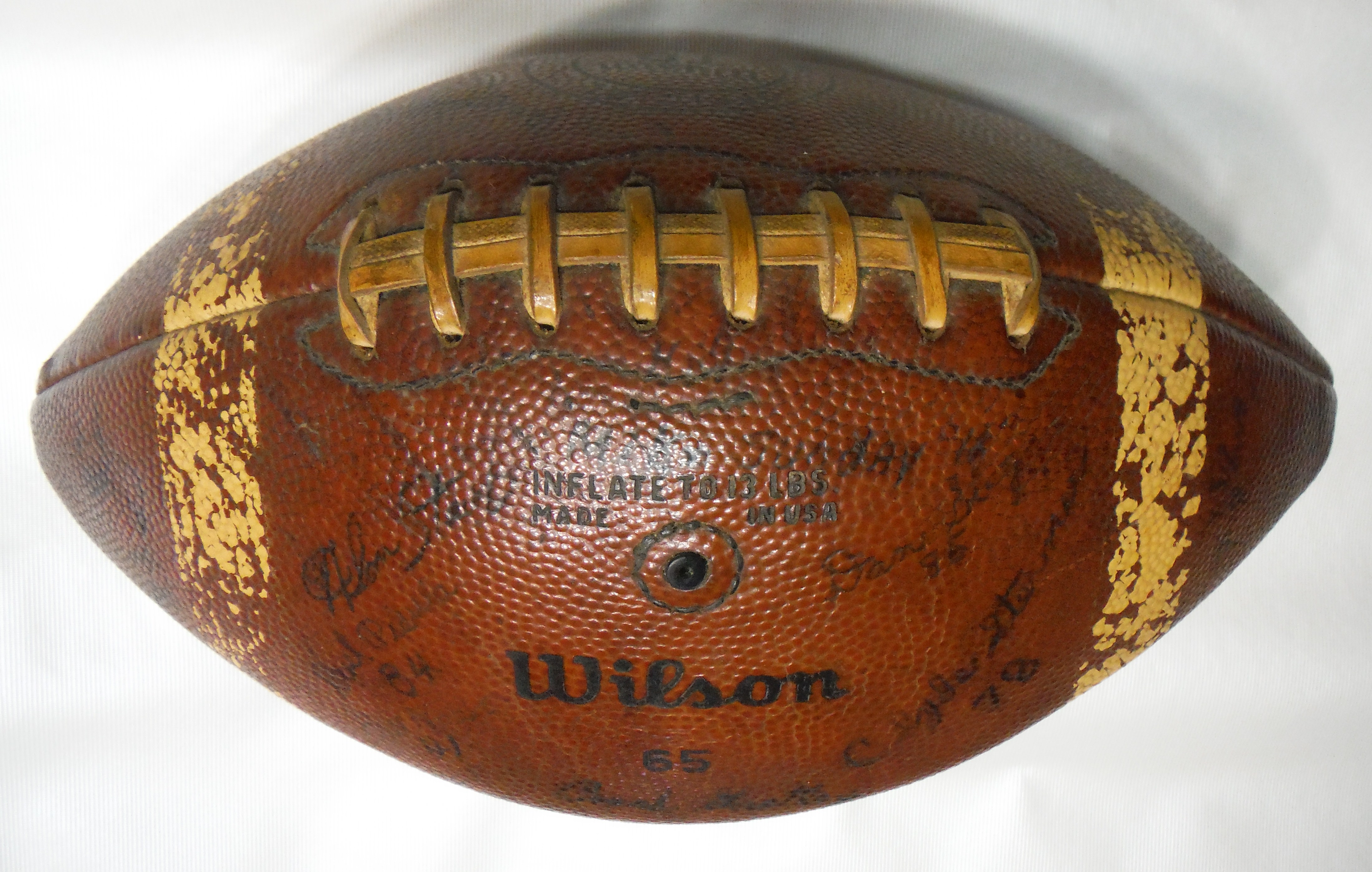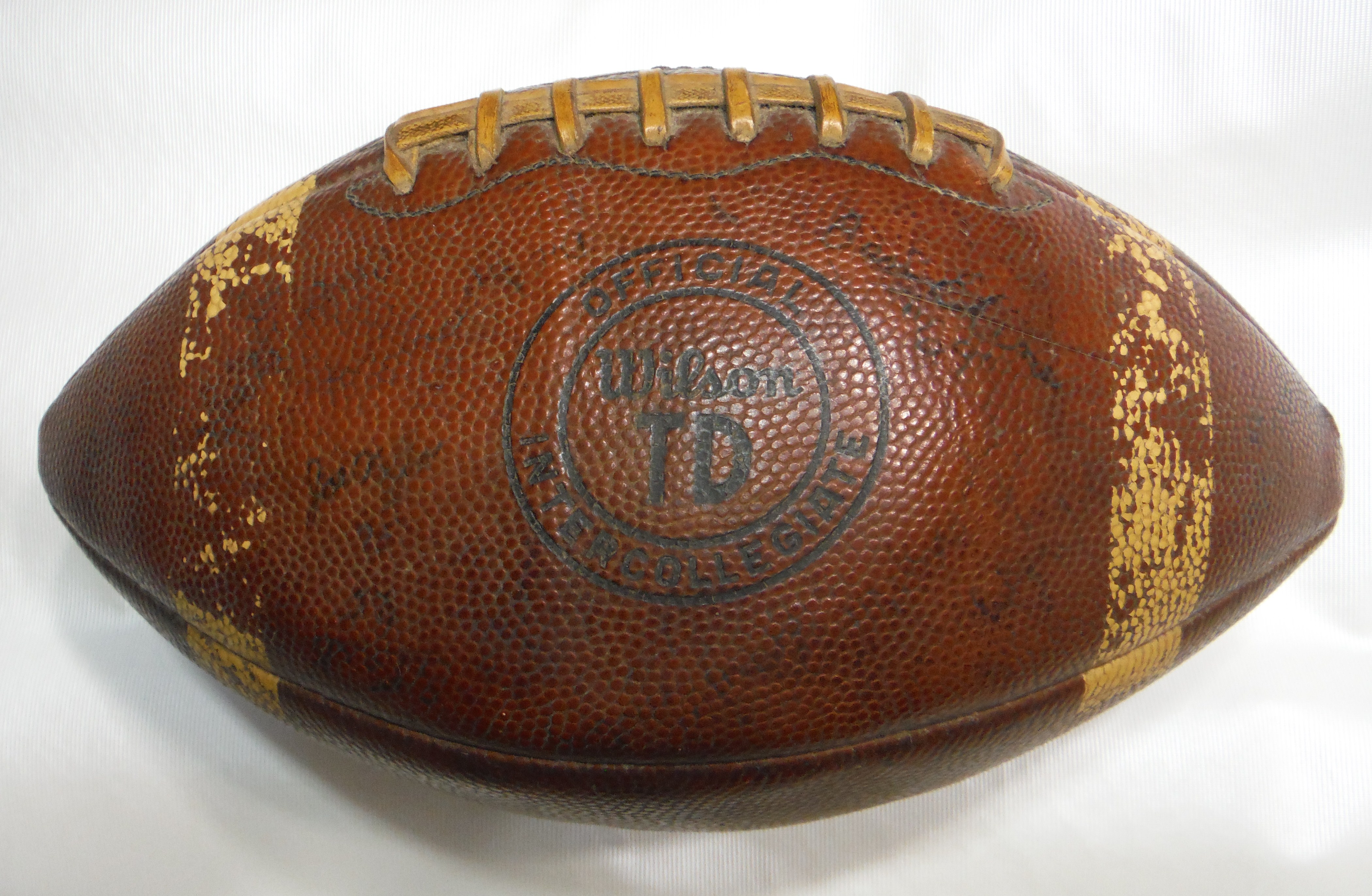 This is a college regulation "Wilson 65" football. The ball is labeled: "Official Intercollegiate, Wilson, TD" This football contains about thirty autographs, including Bonneauville resident Tom Clabaugh, No. 21. The signatures of Delone's coaches; John Gastley Jr. and Harry Walters are on the ball as is New Oxford's coach Gardy Lawrence. The ball appears to have been coated with a clear finish at an earlier time in order to preserve the signatures, and the ball's importance.