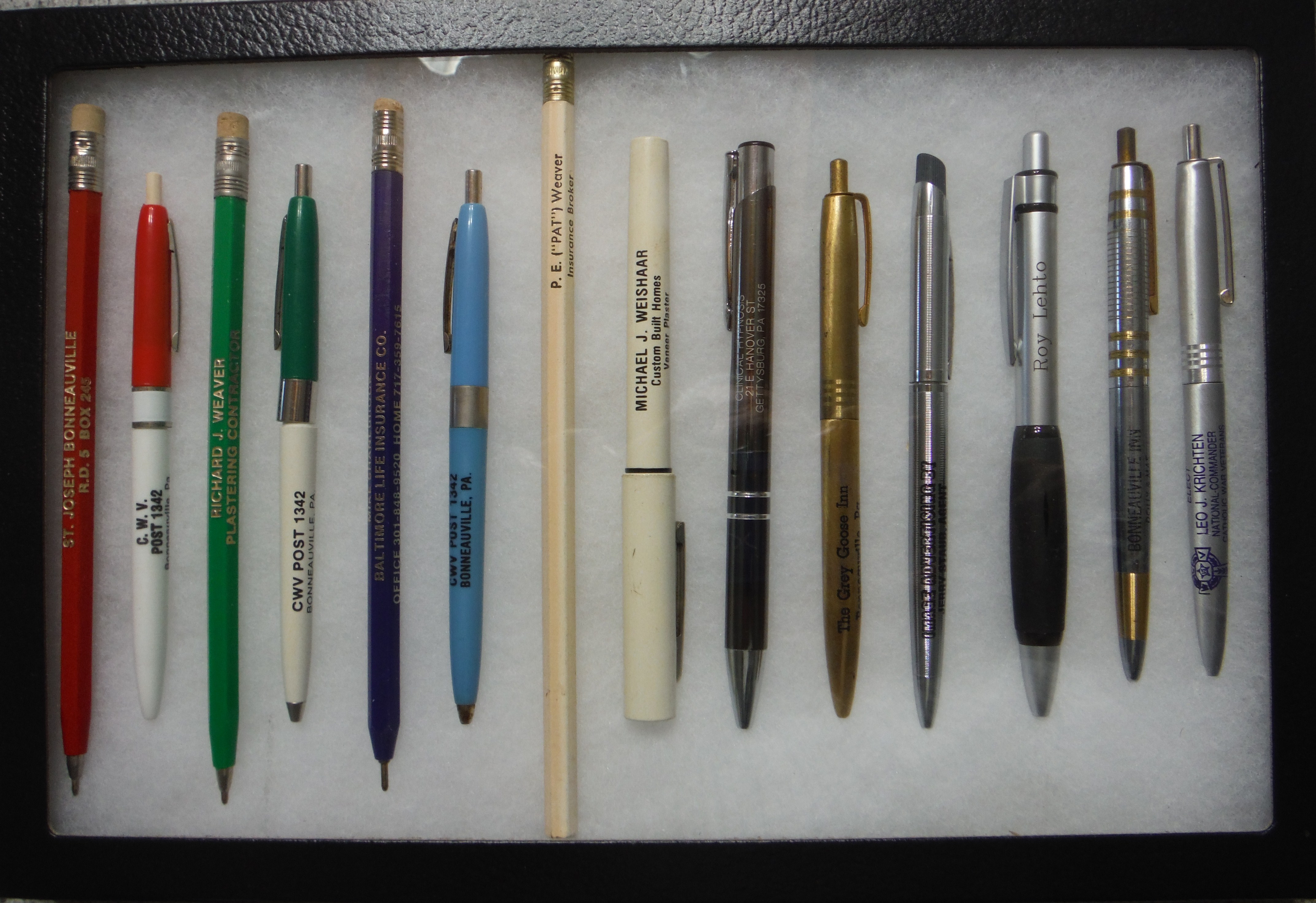 This display box holds a collection of fourteen Bonneauville advertising pens and pencils. Listed below in order from top: St. Joseph, Bonneauville.
