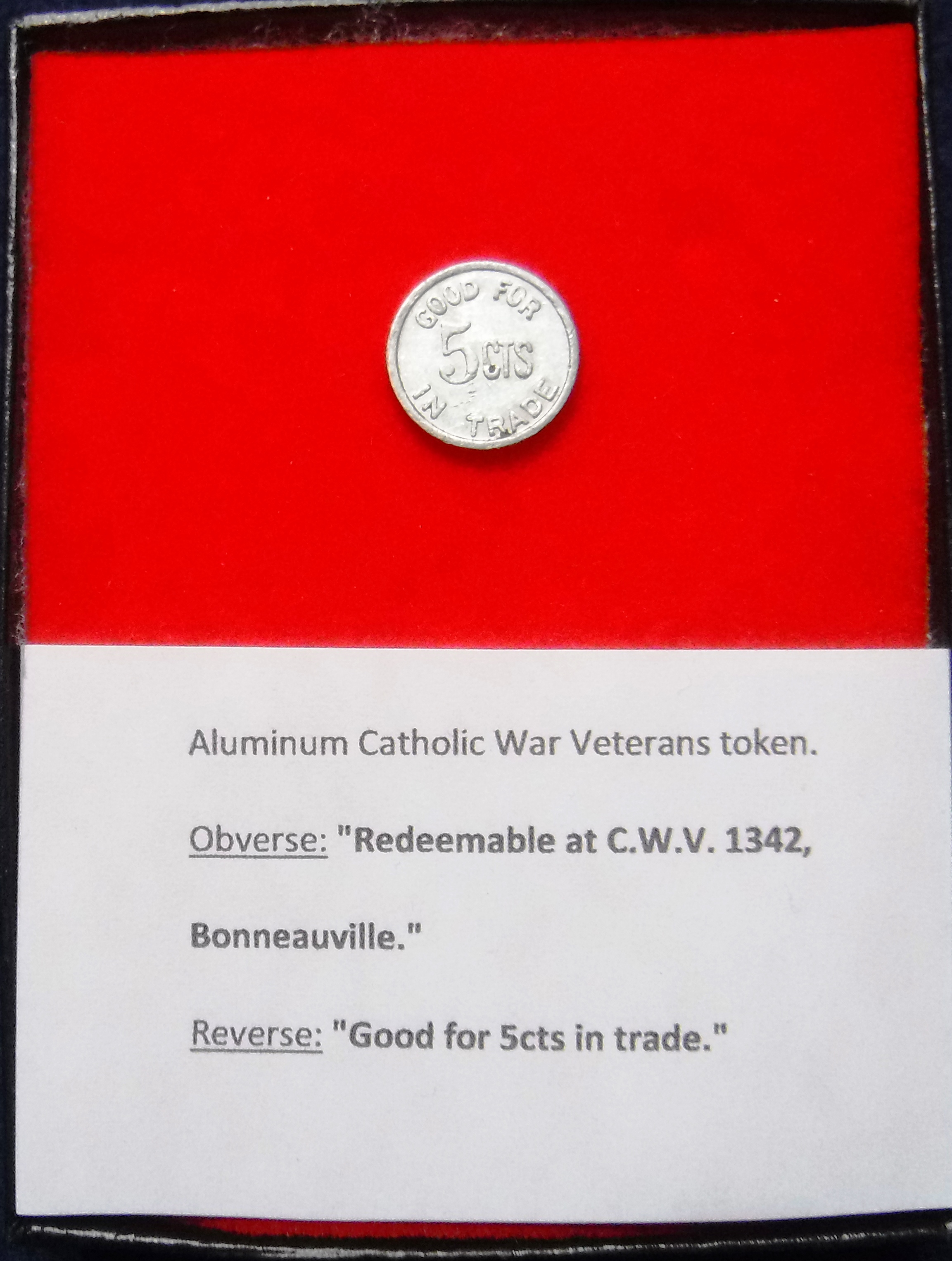 Aluminum Catholic War Veterans trade token. 5/8 " diameter. Sometimes called "merchants tokens" or "good fors".