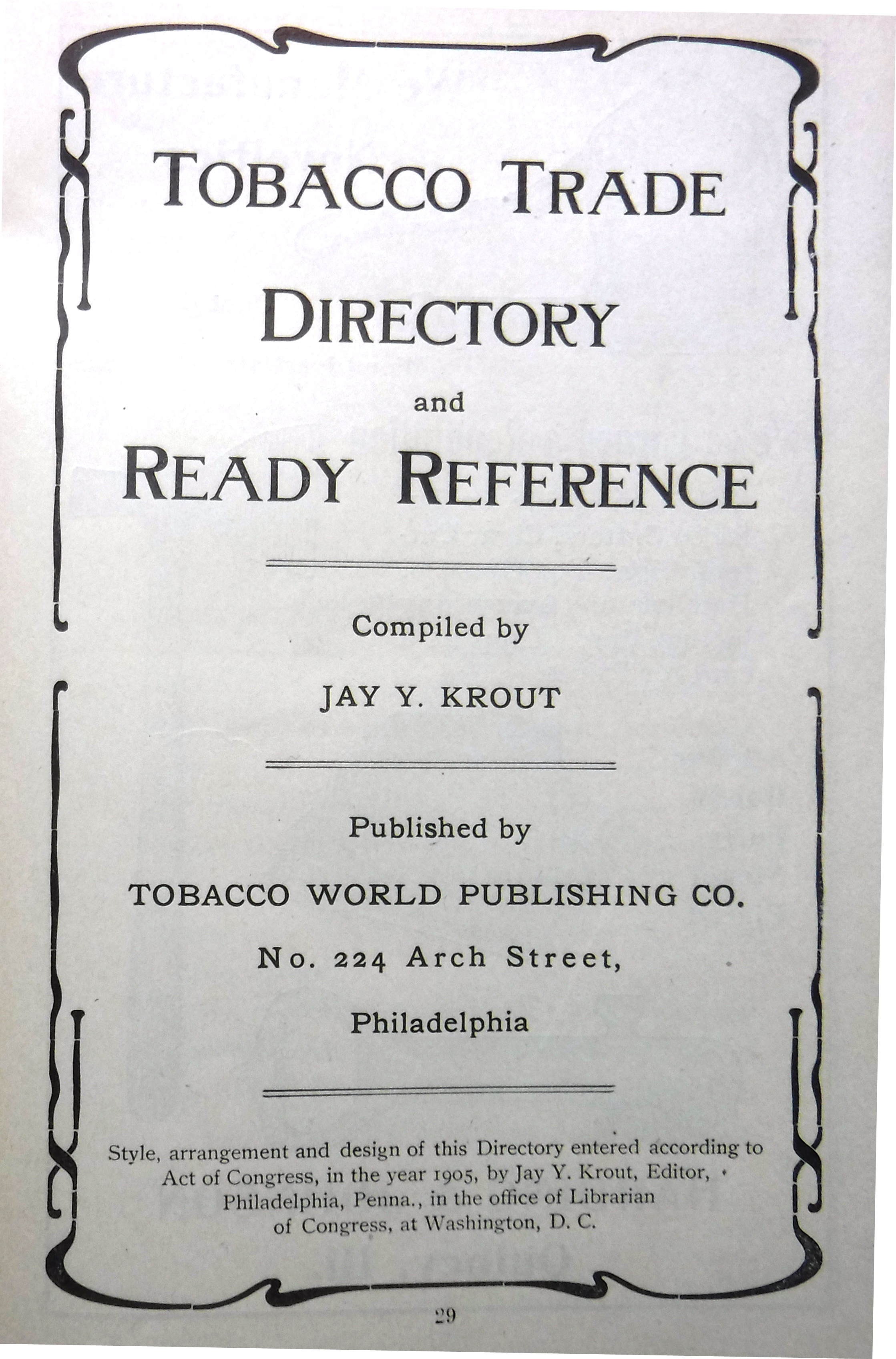 Style, arrangement and design of this directory entered according to Act of Congress, in the year 1905, by Jay Y. Krout, Editor, Philadelphia, Penna., in the office of Librarian of Congress, at Washington, D. C.