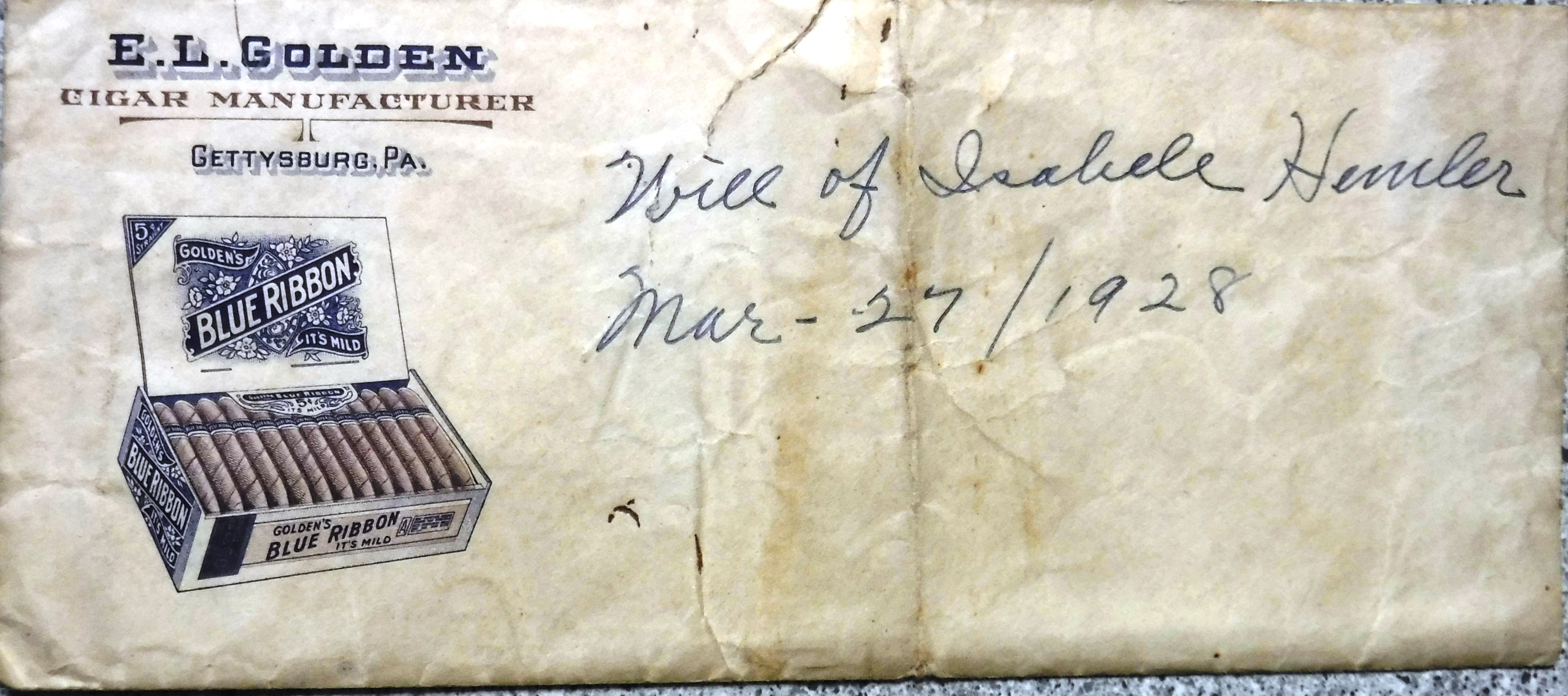 On this folded and tattered envelope is written: Will of Isabele Hemler, Mar - 27/1928. The written date is not an indication of the age of Golden's envelope.