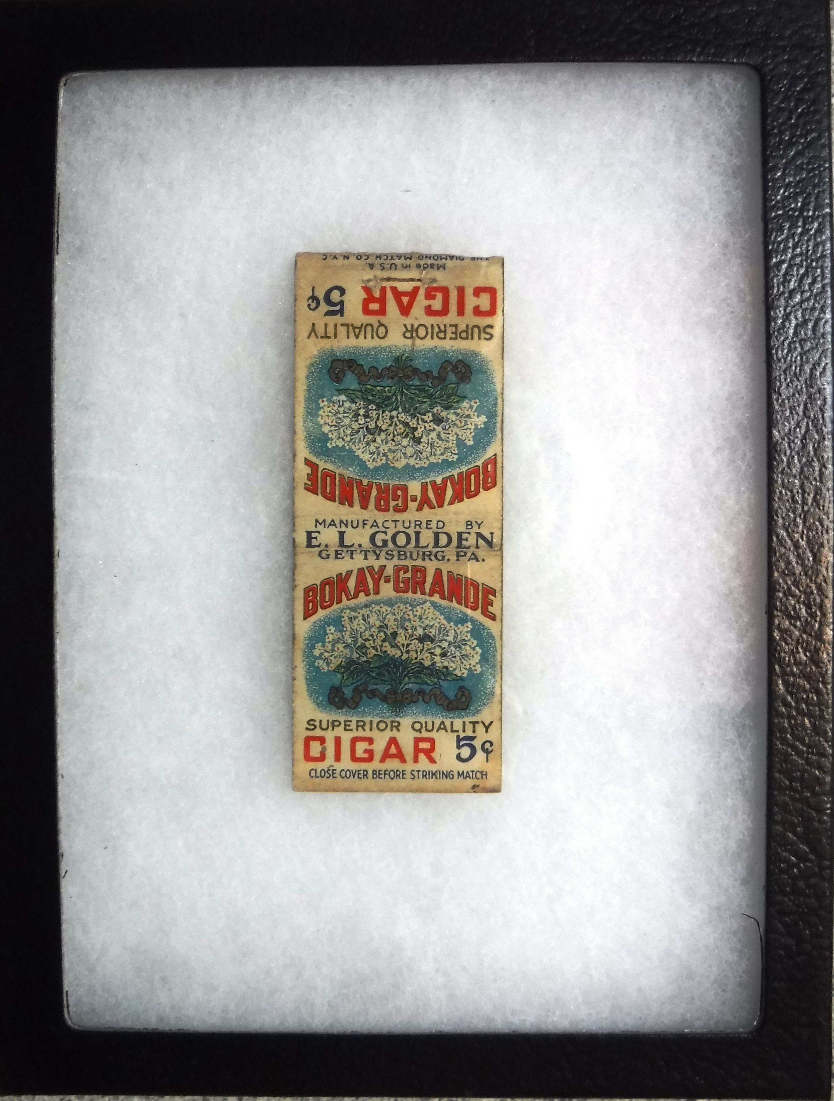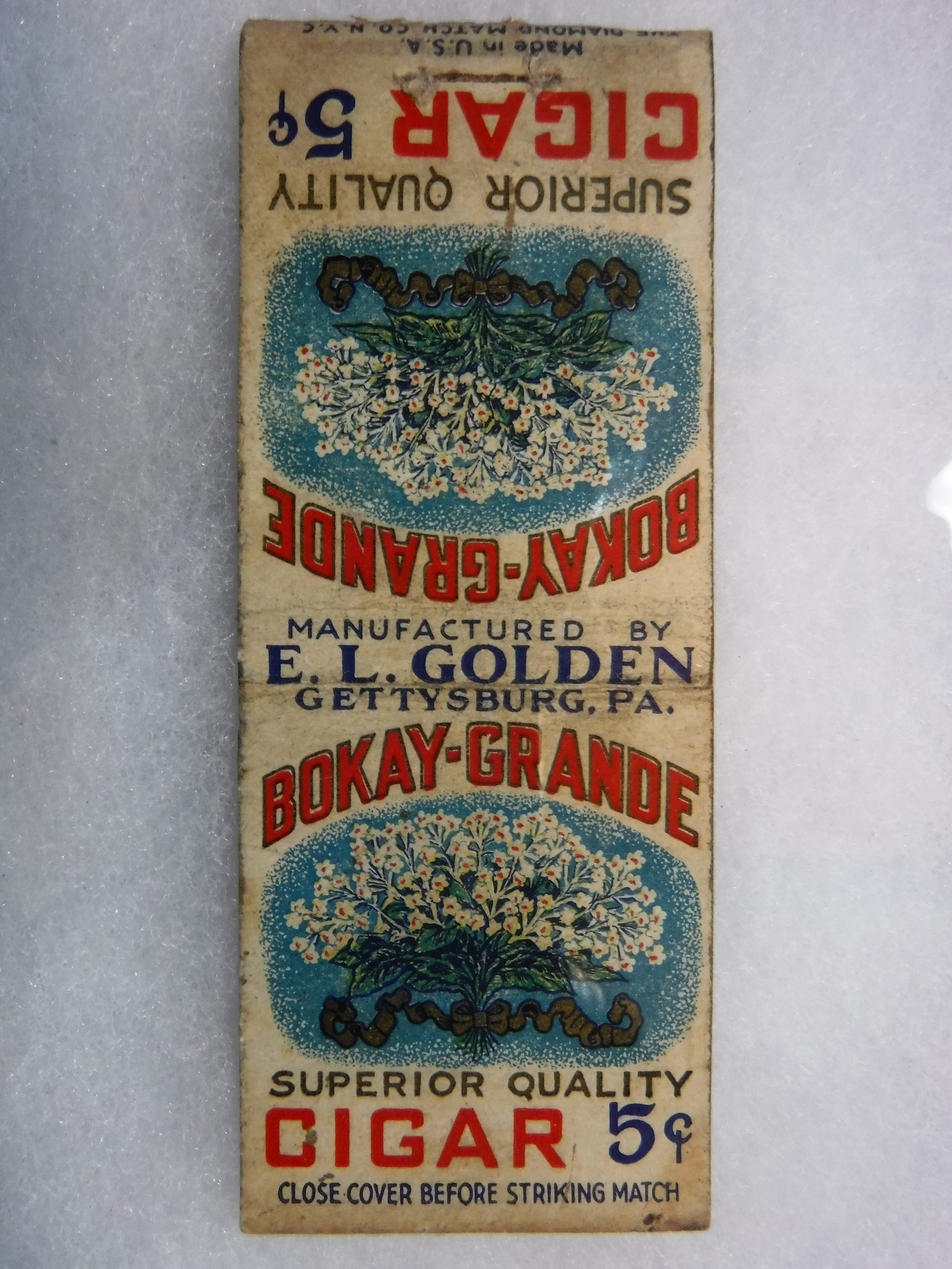 Cover text and design: On both sides of the cover is a large bouquet of ribbon bound flowers (tobacco blossoms ?) on a blue background. Text on cover: "BOKAY-GRANDE Superior Quality CIGAR, 5 Cents" and "Close cover before striking match." Text on saddle: "Manufactured by E. L. Golden, Gettysburg, PA." Text at striker patch: "Made in U.S.A., The Dianond Match Co., N. Y. C."
