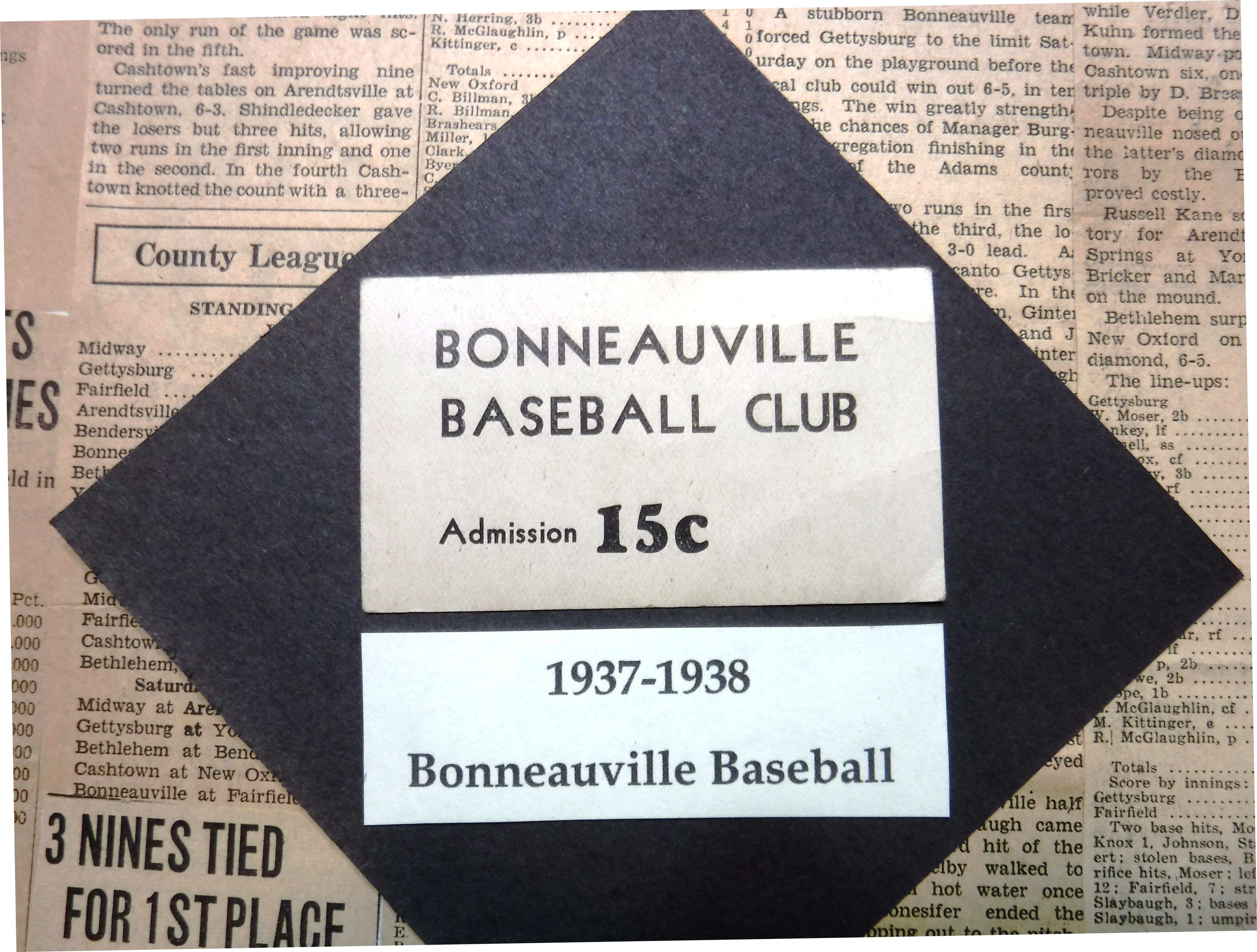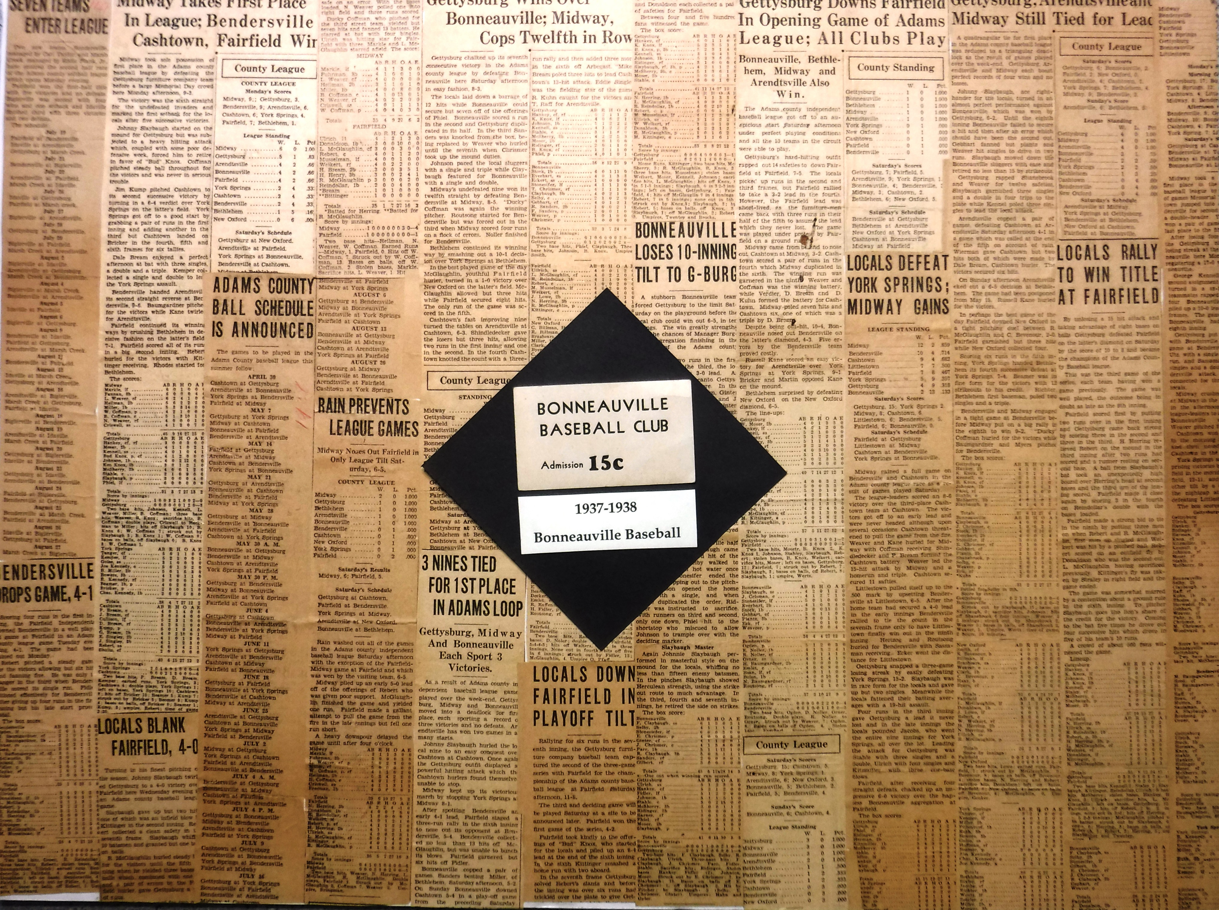 "Bonneauville Baseball Club, Admission 15 Cents" reads this ticket stub. On the packet of newspaper clippings that accompany the stub is hand-written "1938". It was the time of the Great Depression and baseball was a big deal in Bonneauville and the surrounding small towns.