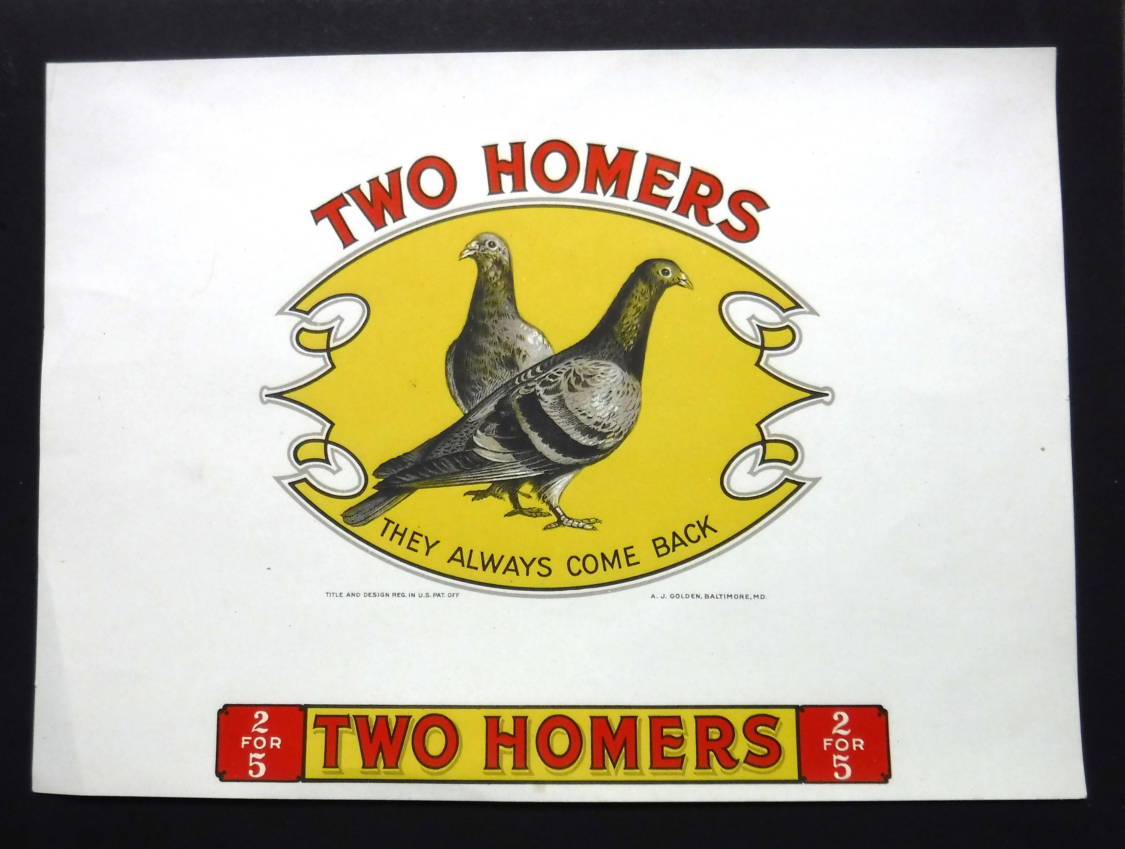The Book "Bonneauville History and Lore" lists nine cigar brand names that the Goldens of Bonneauville, PA produced. The brand names were gleaned from 2002 interviews of ancestors of Emory and A. J. Golden. The brand "Two Homes" is listed in the book. This cigar label shows the name to be in error. The label shows the correct name to be "Two Homers" referring to two homing pigeons. "They always come back" is the slogan. The two for five cents price indicates an early Goldens product.