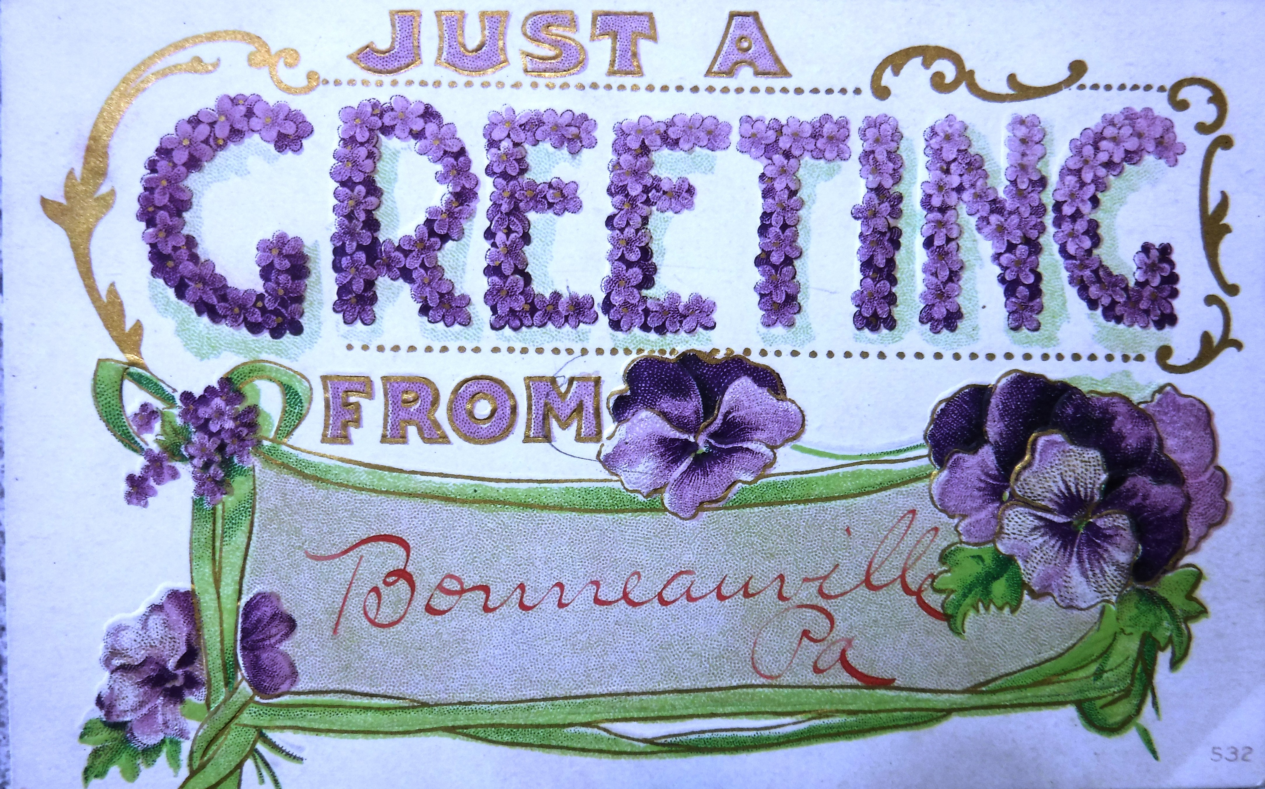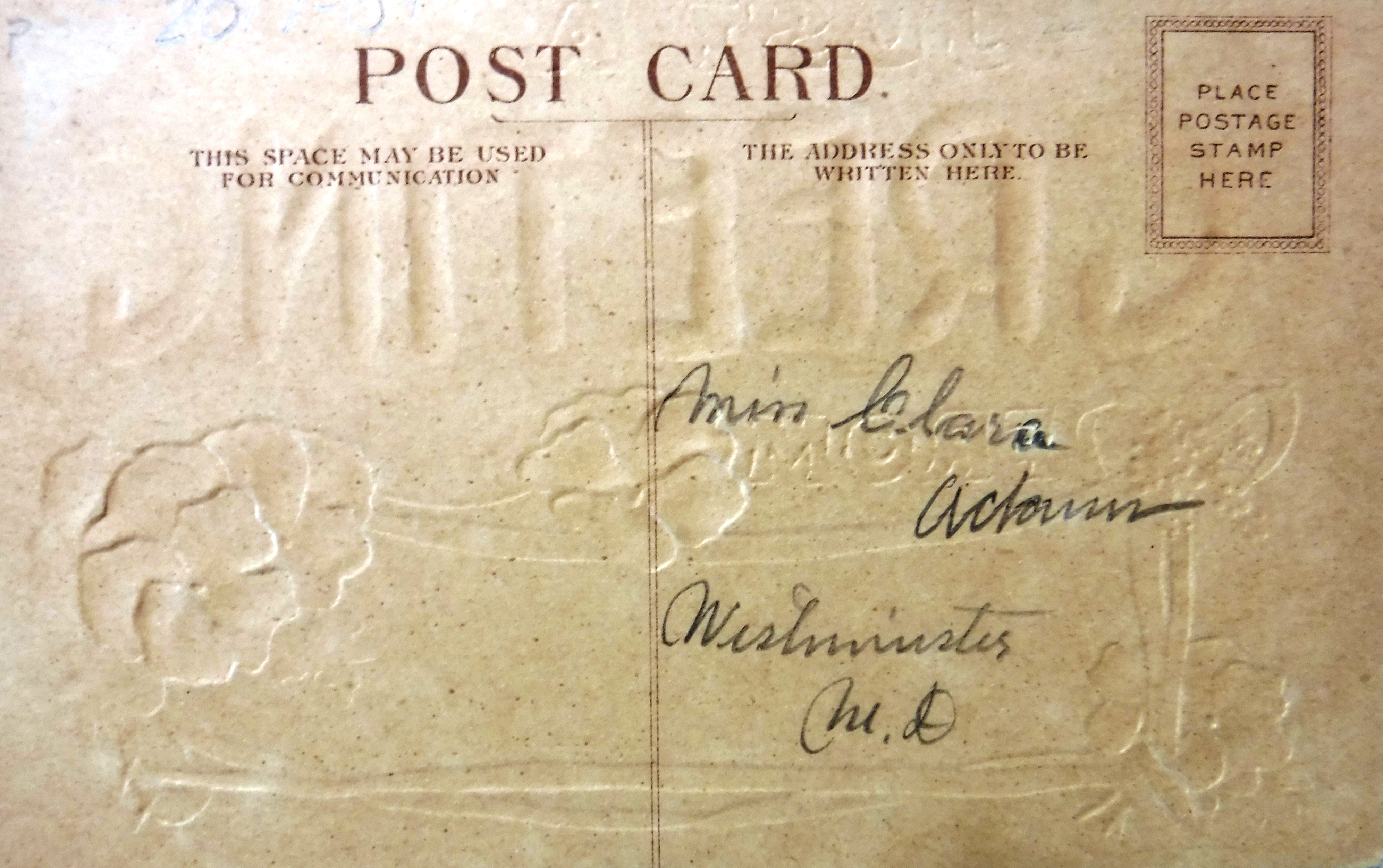 This generic penny-postcard bears no manufacturer/printers name. The embossed pansy flower design states: "Just a Greeting From." A ribbon framed blank space leaves room for the sender to specify in his own hand, the origin of the card. In this case "Bonneauville, Pa is neatly scripted in the space in red ink. On the reverse of the card, in the address block is written in pencil: "Miss Clara A___, Westminster, Md." The communications block is blank. There is no postage stamp. The card was never mailed (though perhaps hand-delivered.)
