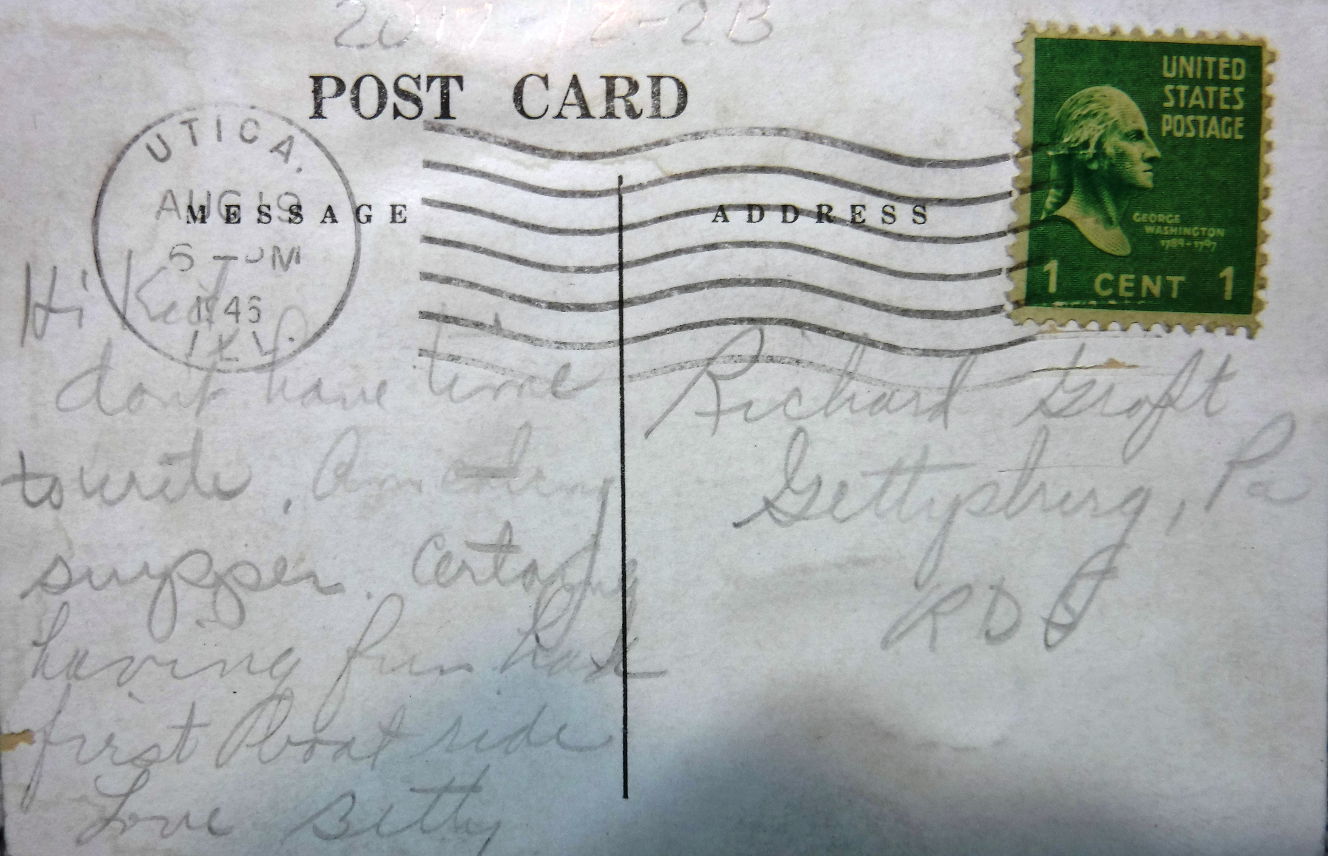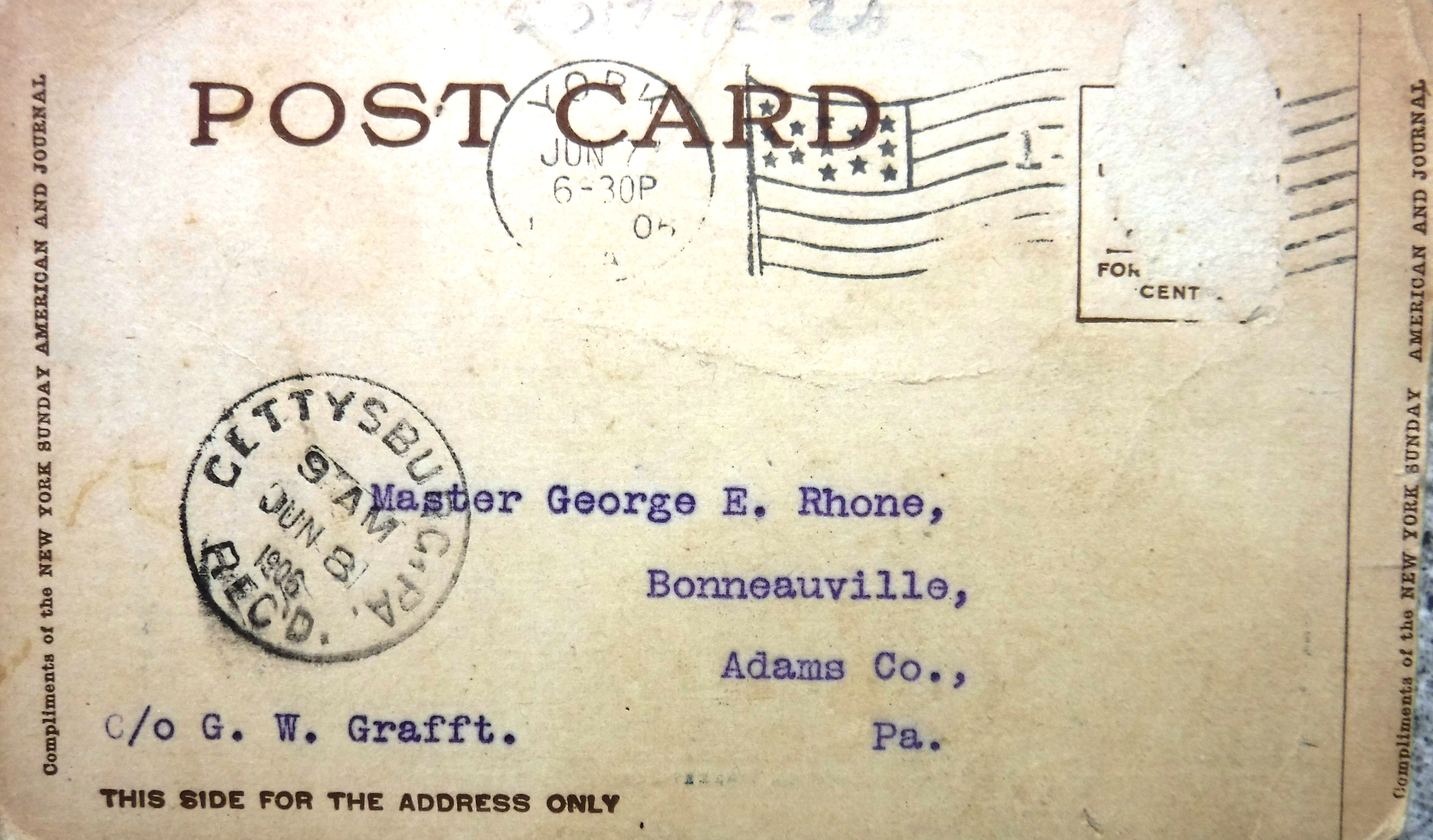This collection of seven various postcards were addressed to To Bonneauville and area citizens. The town address was once R.D. No.5, Gettysburg, PA. For a time prior to that the address was R.D. No. 9, Gettysburg, PA.