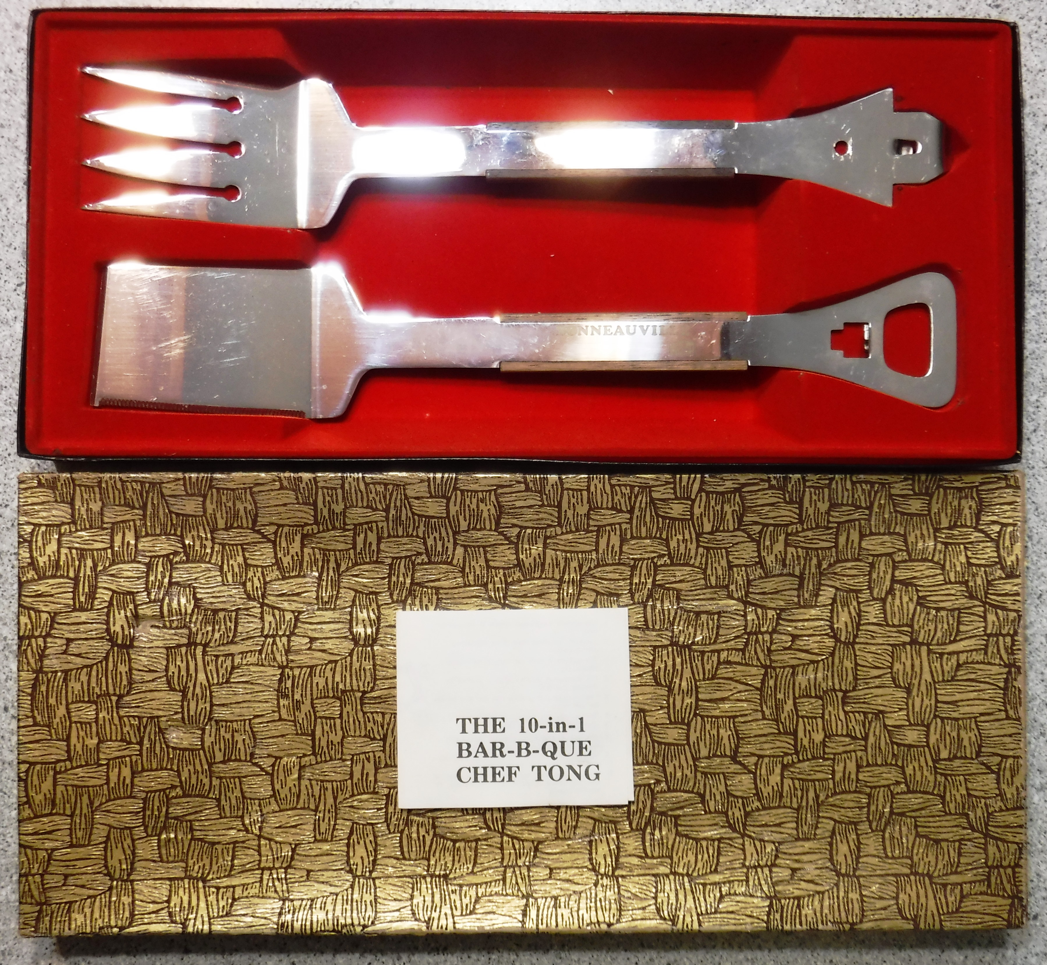 A two piece, boxed set of cooking tools titled: "The 10-in-1 Bar-B-Que Chef Tong". One handle is etched with the text: "Bonneauville Super Thrift".