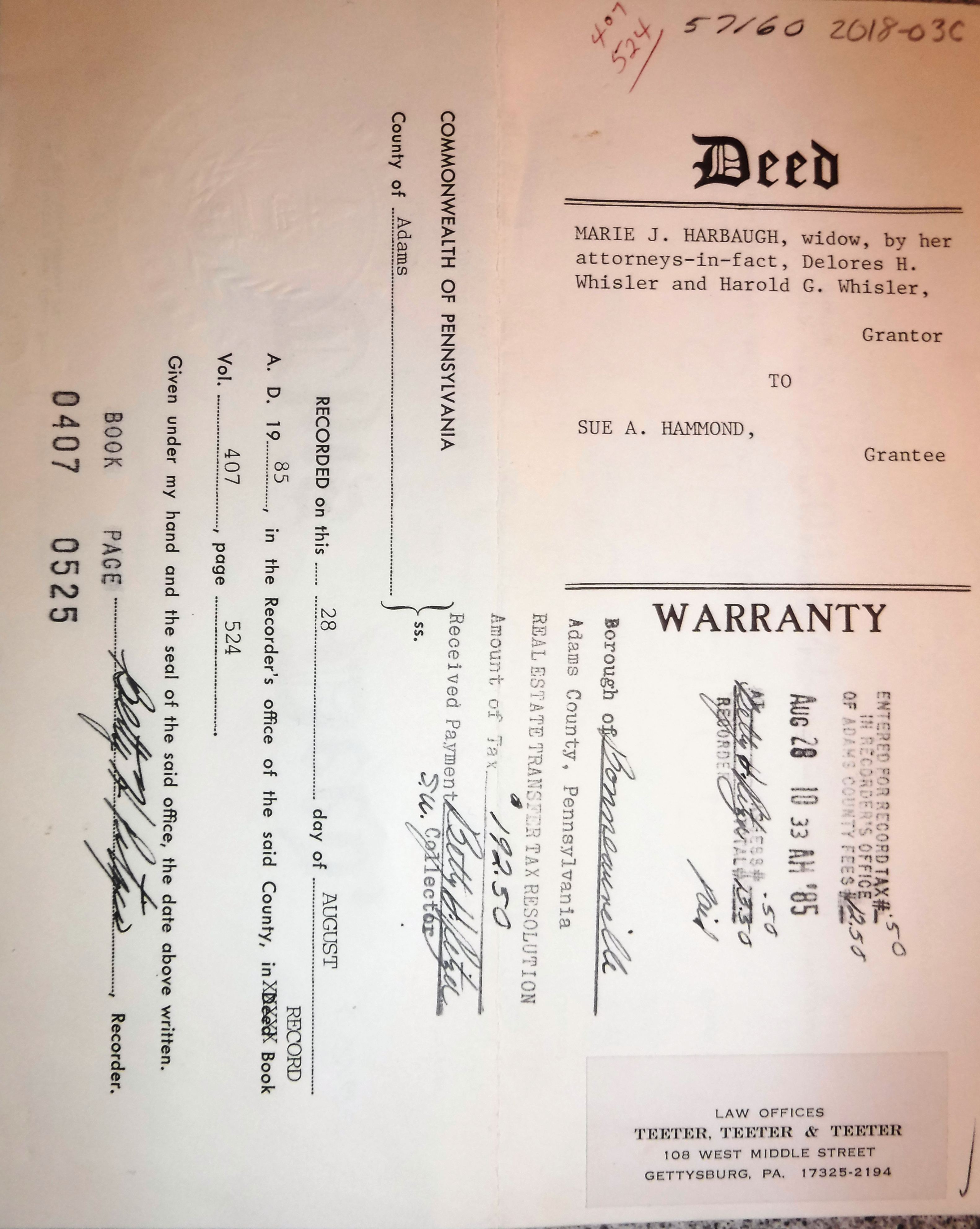 Deed transfer: Marie J. Harbaugh (Delores H. Whisler and Harold G. Whisler) and Sue A. Hammond - 1985.