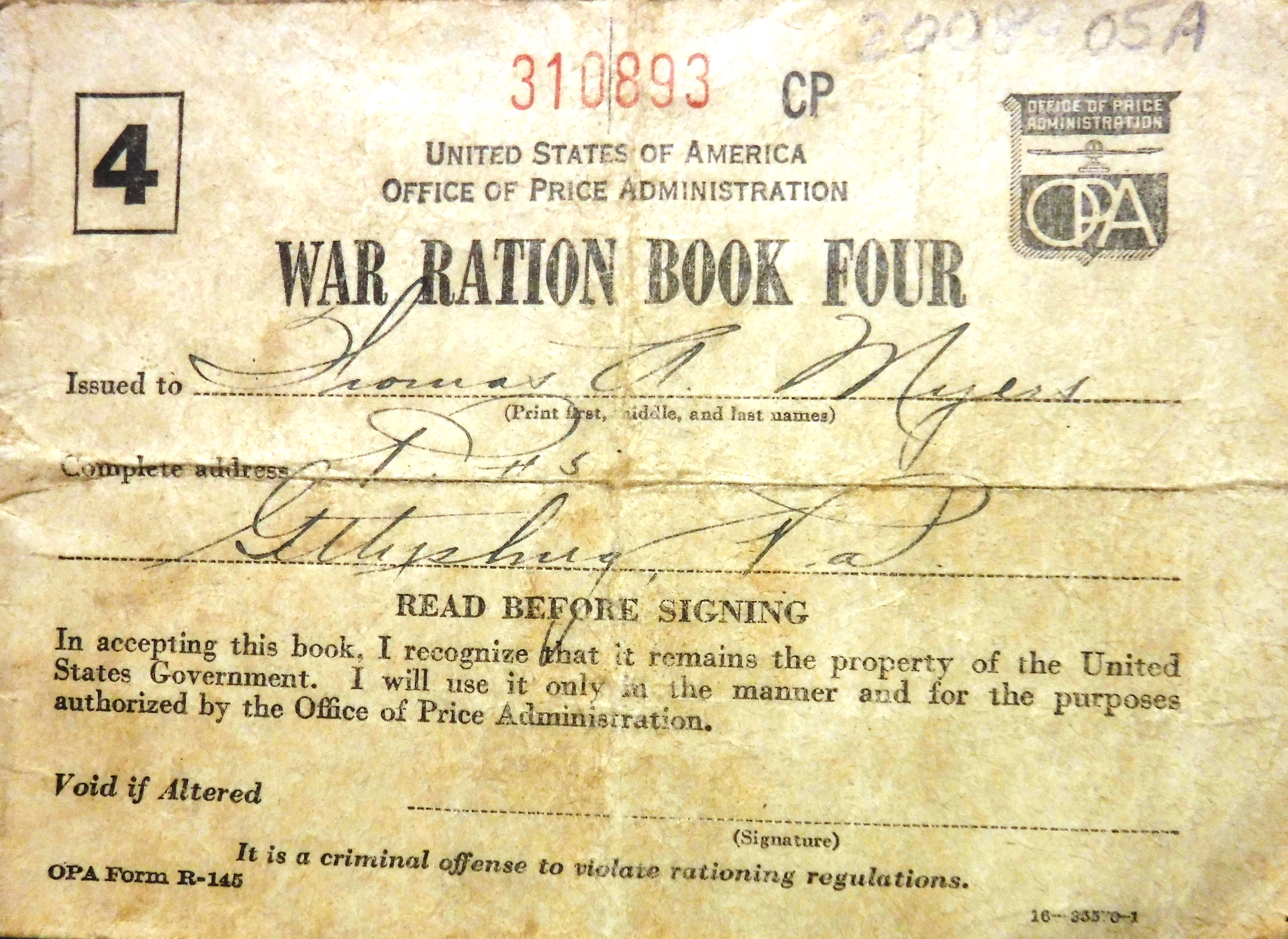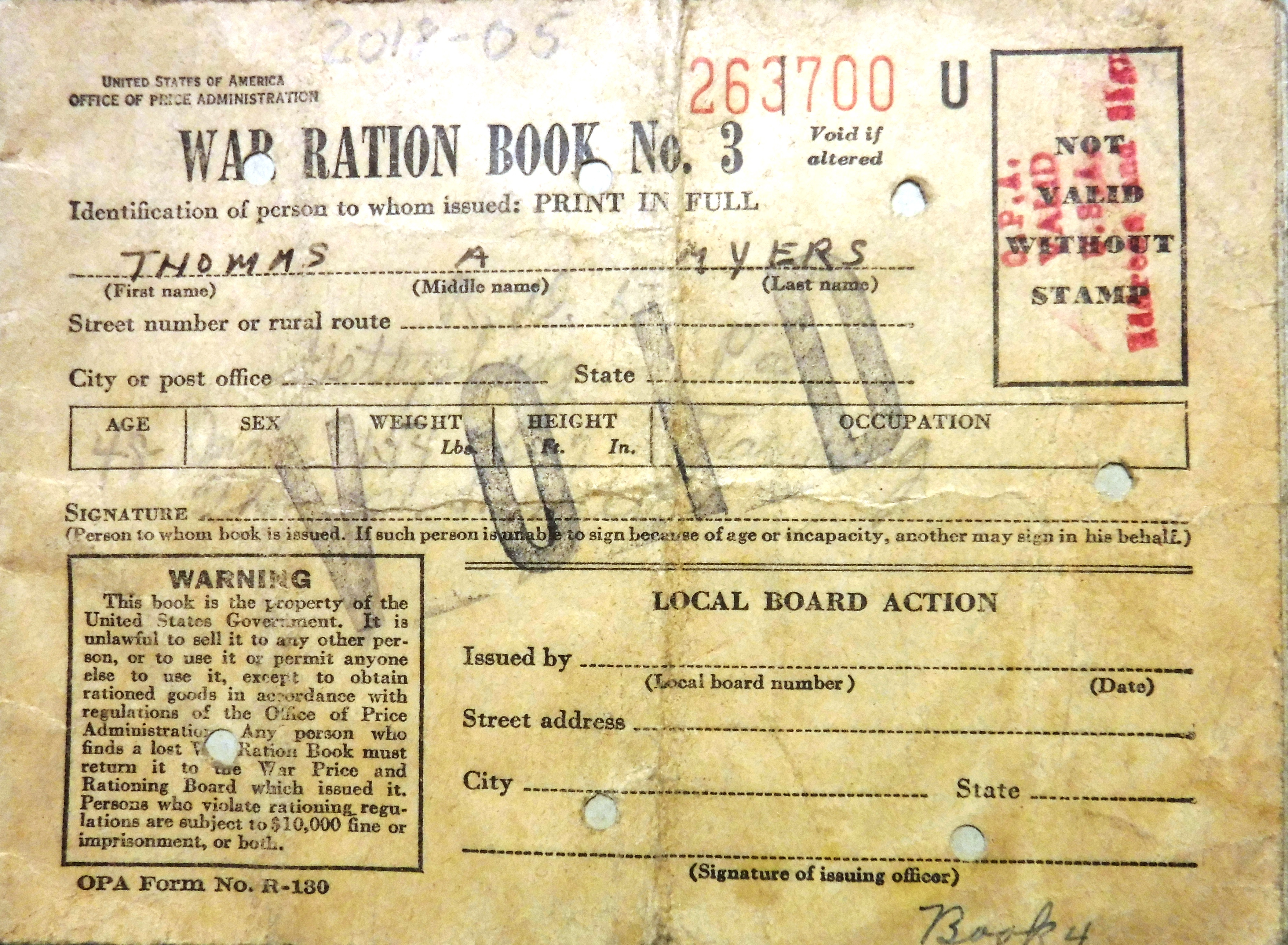 World War II Ration Booklets - Thomas A. Myers (Ambrose Myers/"Brookie" Myers) R.D. 5, Gettysburg, PA.(Bonneauville. PA) Occupation - farming. Age - 48