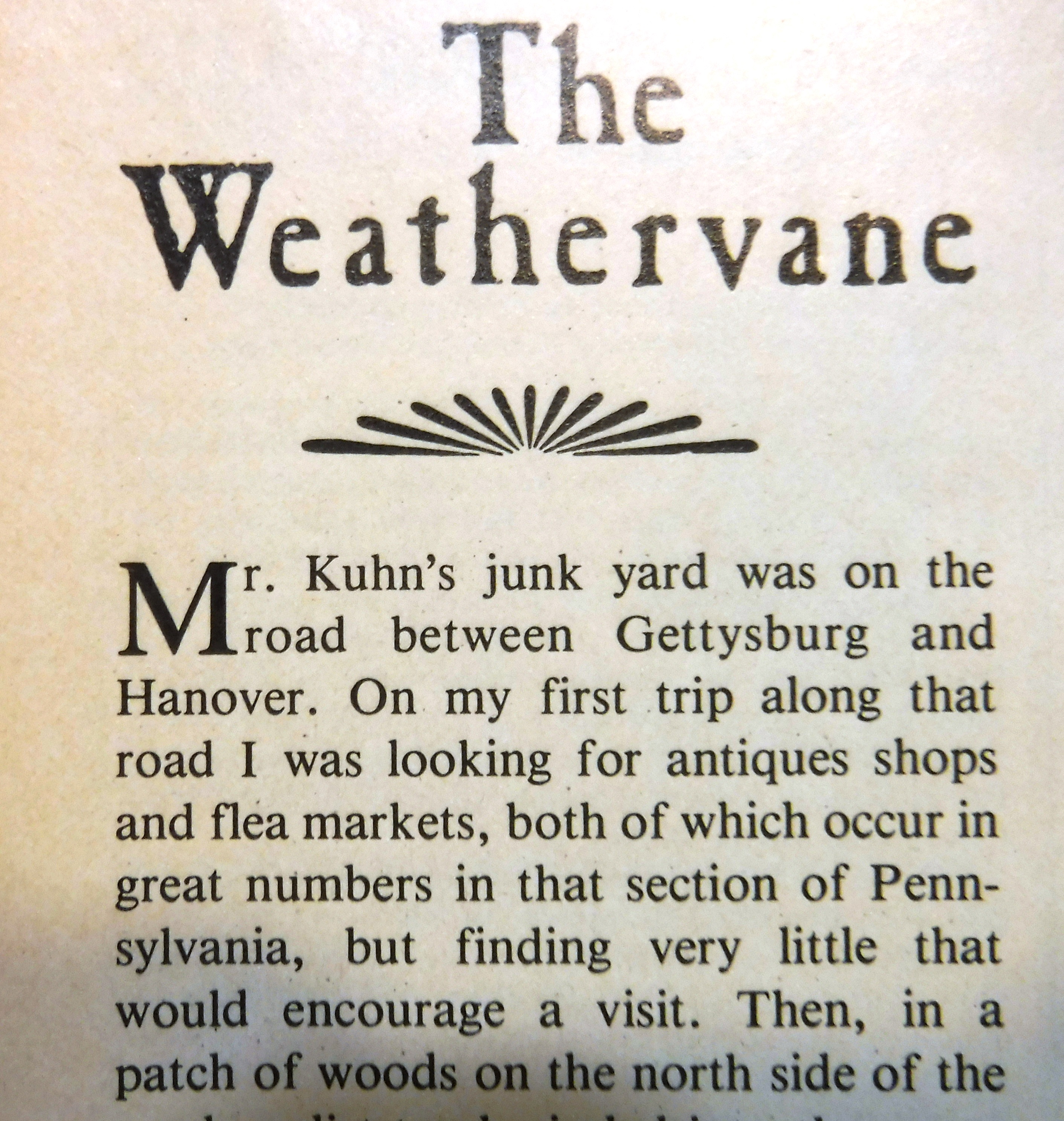 In April of 1982, Robert G. Minor, (RGM), penned an article for Early American Life” magazine, under a column titled “The Weather Vane”. In the article Mr. Minor (of Connecticut) described with delight, the antique purchases he made at Simon Kuhn’s establishment.