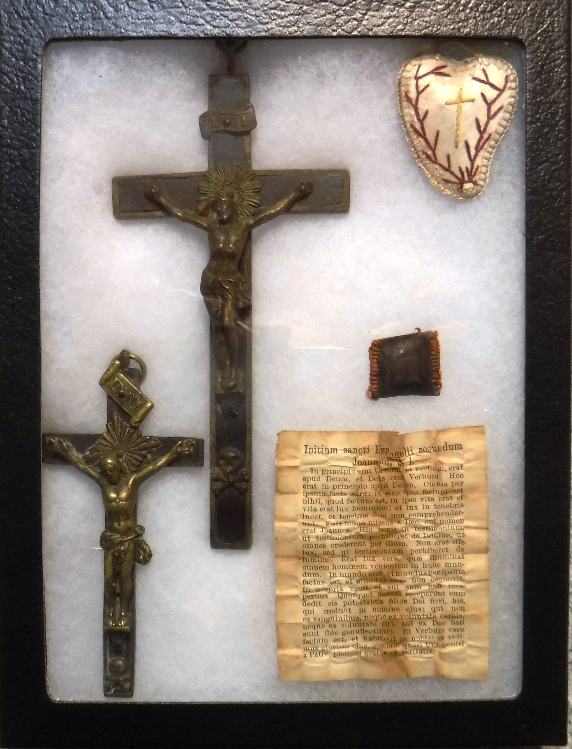 A 6" x 8" display case containing two large, early crucifixes, and a small white cloth heart with needlepoint branches and cross. Also contained is a tiny leather pouch about the size of a dime. Within the pouch was a twenty-six line prayer in Latin, printed on thin onion skin like paper of 2 1/4 inches x 2 3/4 inches.