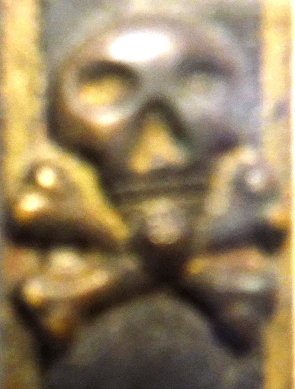 The two crucifixes measure 5 1/4" x 2 3/4" and 3 3/4" x 1 3/4" Both are brass on wood construction. Both display a brass skull and crossbones below the feet of Jesus. Indicative of their age, the use of the skull and crossbones on religious crucifixes was already in decline by the end of the 1800's.