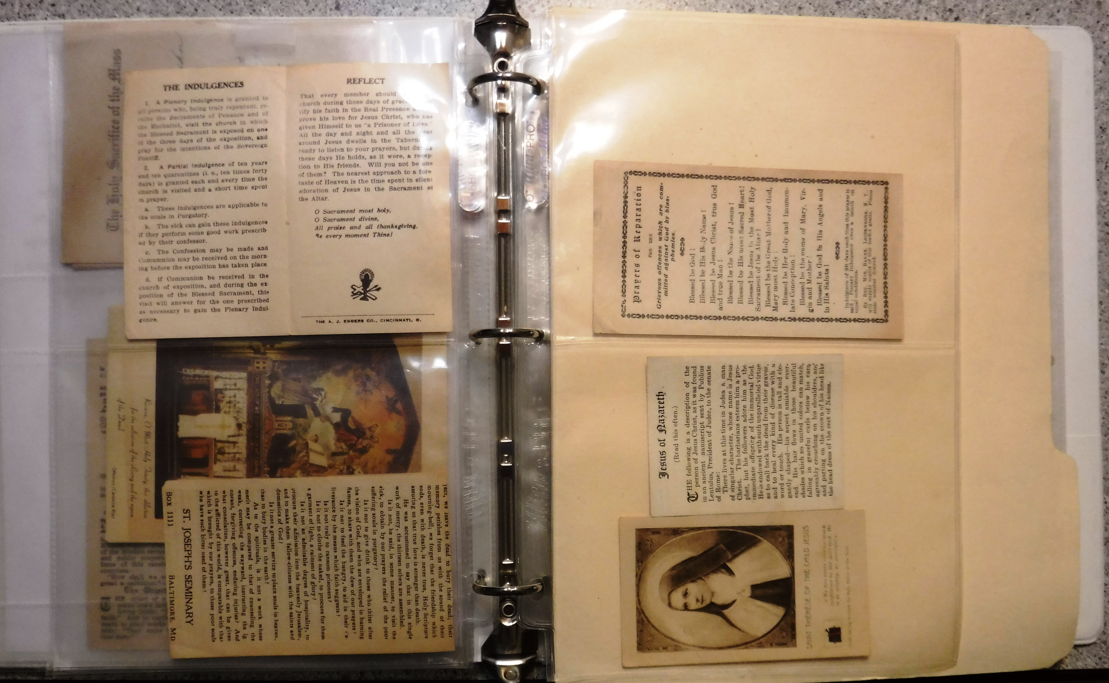 Approximately forty prayer cards and booklets are contained in this white binder. Anna Kuhn, her parents Simon and Annie Kuhn, and the Bevenours. Shorbs and other families before them were devout followers of the Catholic Religion. The contents of this binder reflects their religious beliefs.