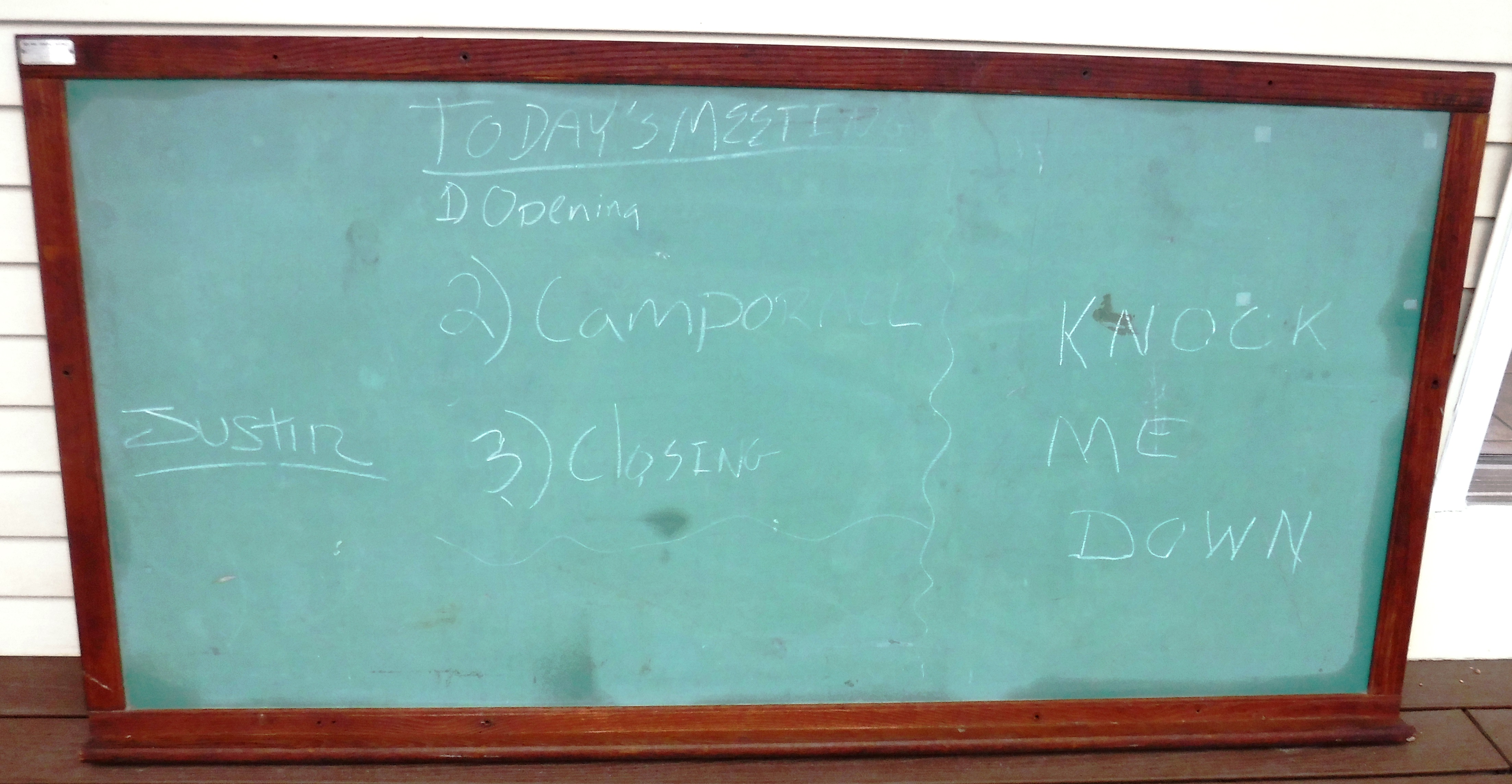Cat. No. 2018-17-2 chalk board was removed from the 2nd story of the old school building before the structure was raised. The aluminum U.S. Government ownership tag is still attached. Text on the tag reads: "New York Ordnance Department, Dept. of Army Contract No. 01-30-069-ORD-1820, US Property No. NY00-1820-US-490."