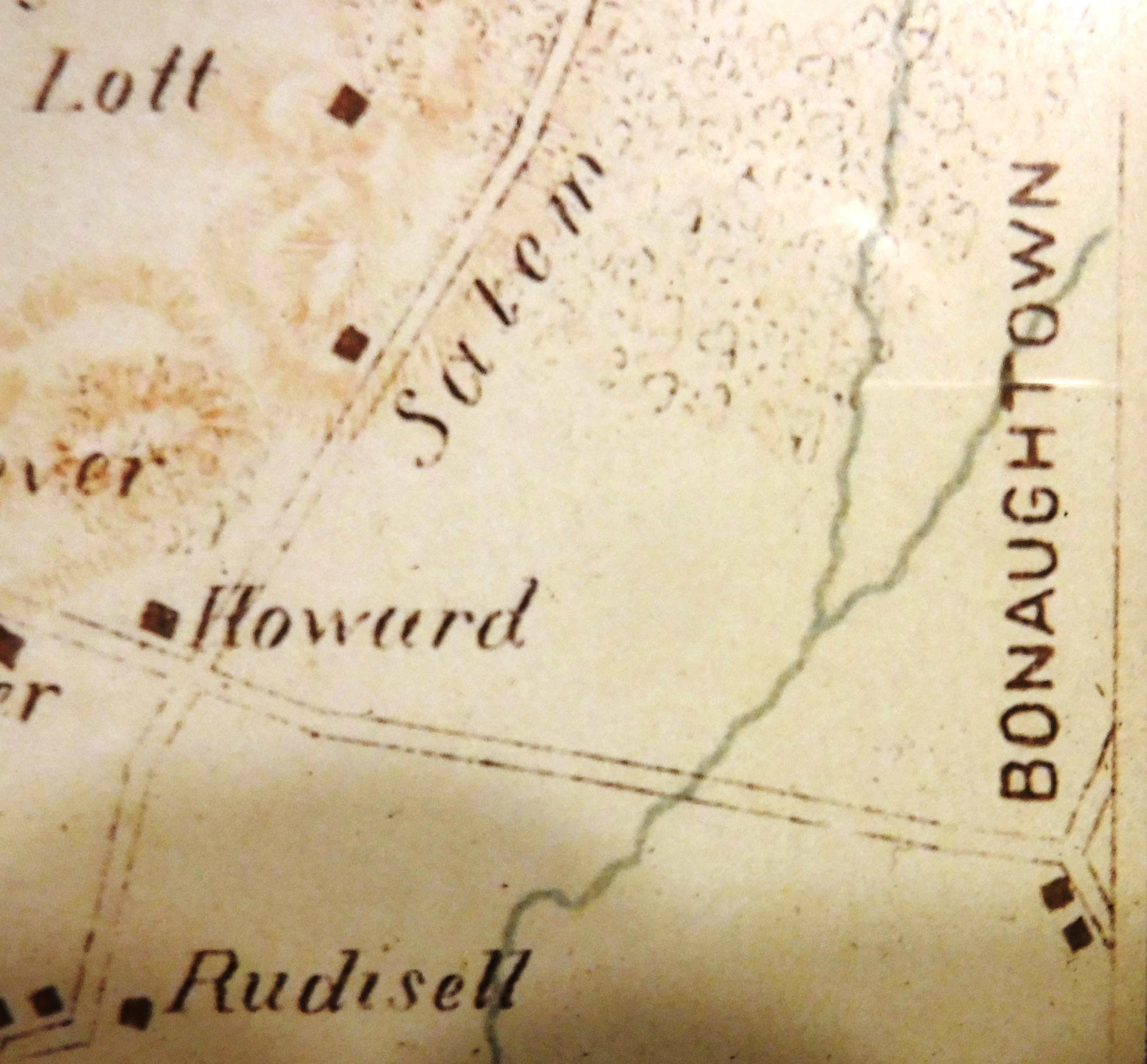 This map spans the area from Gettysburg to Bonaughtown during July 2nd and 3rd, 1863. The road between the two towns is labeled; "Hanover or Bonaughtown Road". The topographical layout gives a good perspective of how close to the town of Bonnneauville the Battle of Gettysburg, and especially the BAttle of East Cavalrt Field, had come. The map also depicts the gentle lay of the land between the two towns.