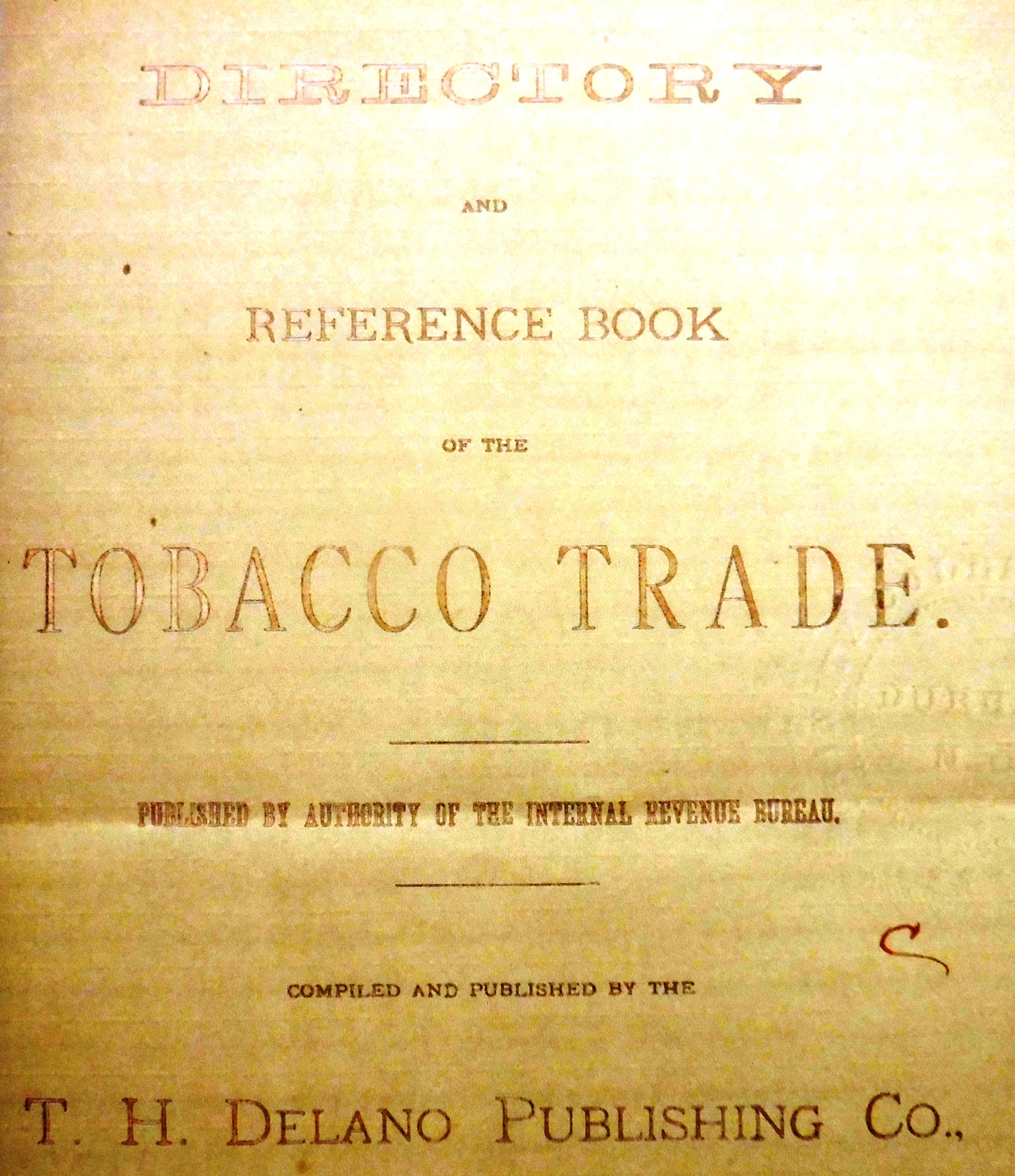 This item consists of two copied pages. The cover page reads: “Directory and reference Book of The Tobacco Trade. Published by Authority of Internal Revenue Bureau. Completed and Published by the T. H. Delano Publishing Co., Proprietors of Tobacco, 102 Chambers Street, New York, Copyrighted 1898.”
