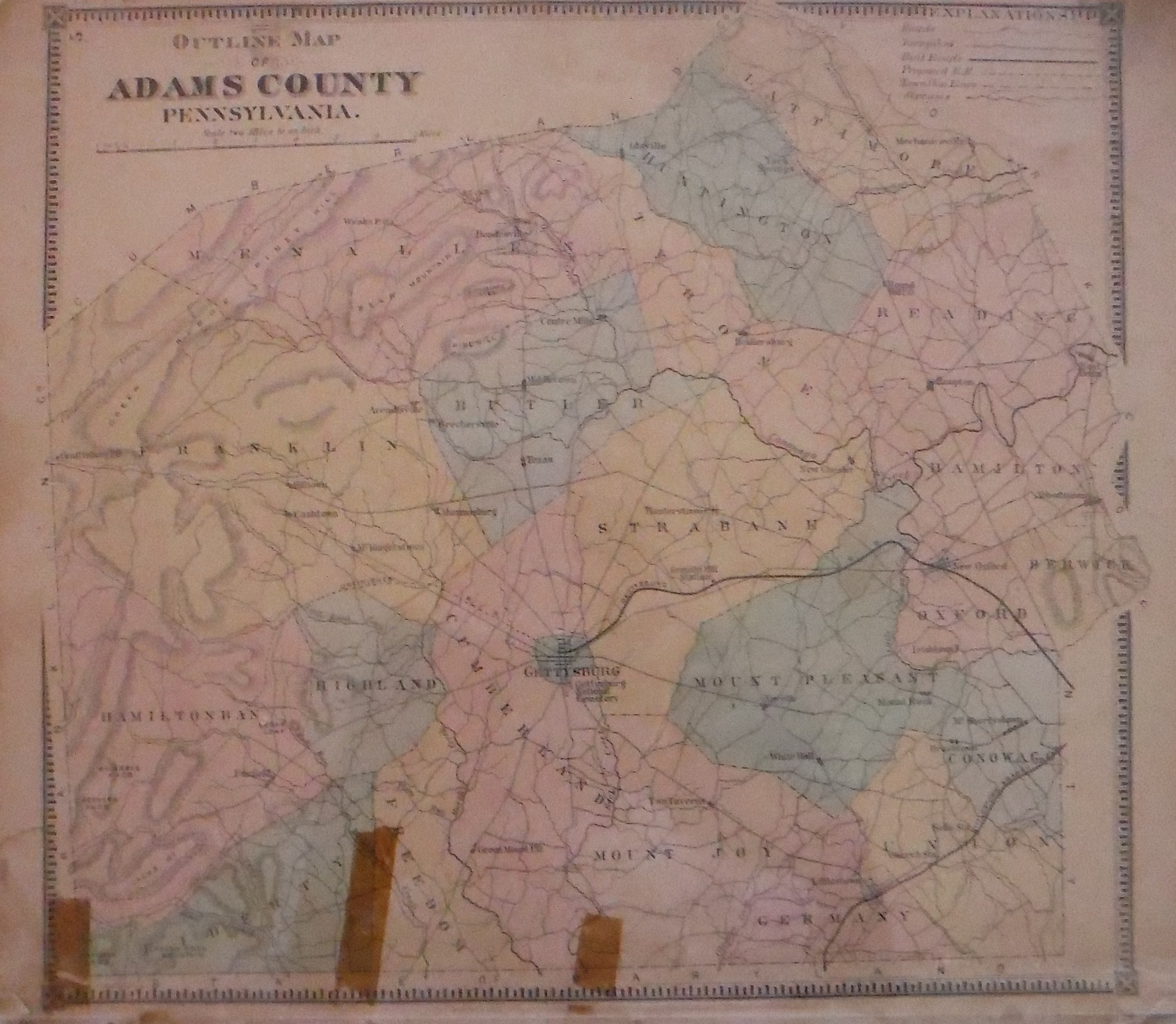 This map is from a disassembled "Atlas of Adams County Pennsylvania, 1872." Mount Pleasant is highlighted in green. Three towns are indicated in Mount Pleasant Township: White Hall (also known as Redland), Mount Rock (Centennial) and Newville (Bonneauville). For a few years around 1872 Bonaghtown was named Newville.