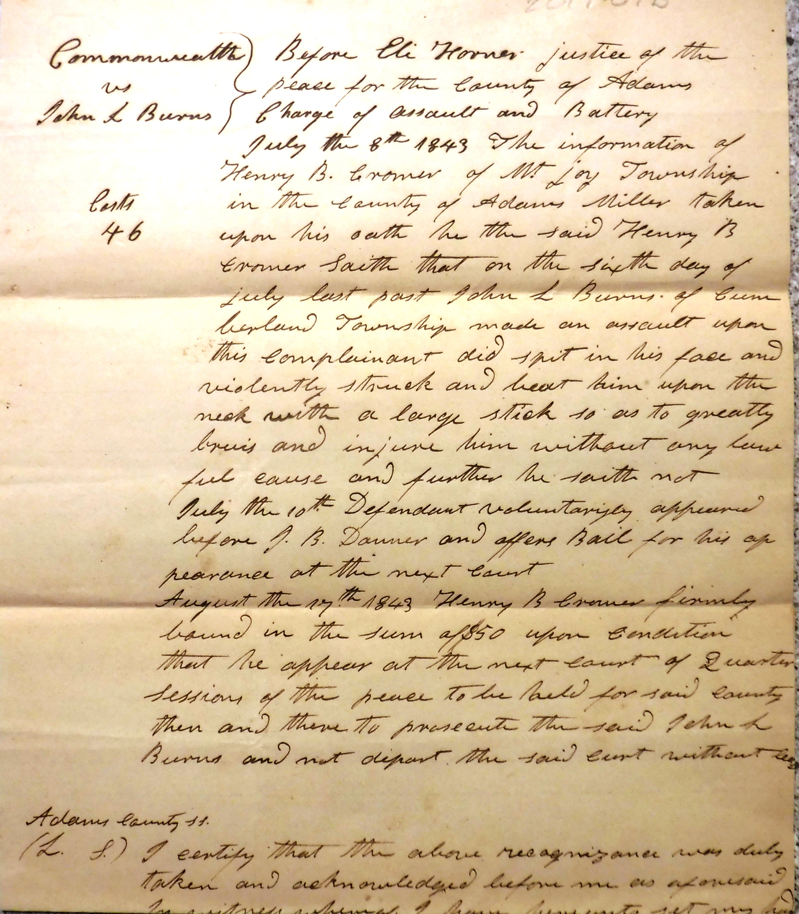 “Before Eli Horner, Justice of the Peace for the County of Adams, charge of assault and battery July the 8th, 1843, the information of Henry B. Craumer? Of Mount Joy Township in the County of Adams. Miller taken upon his oath…Henry B. Craumer saith that on the sixth day of July last past John L. burns of Cumberland Township made an assault upon this complainant. Did spit in his face and violently struck and beat him upon the neck with a large stick so as to greatly bruise and injure him…