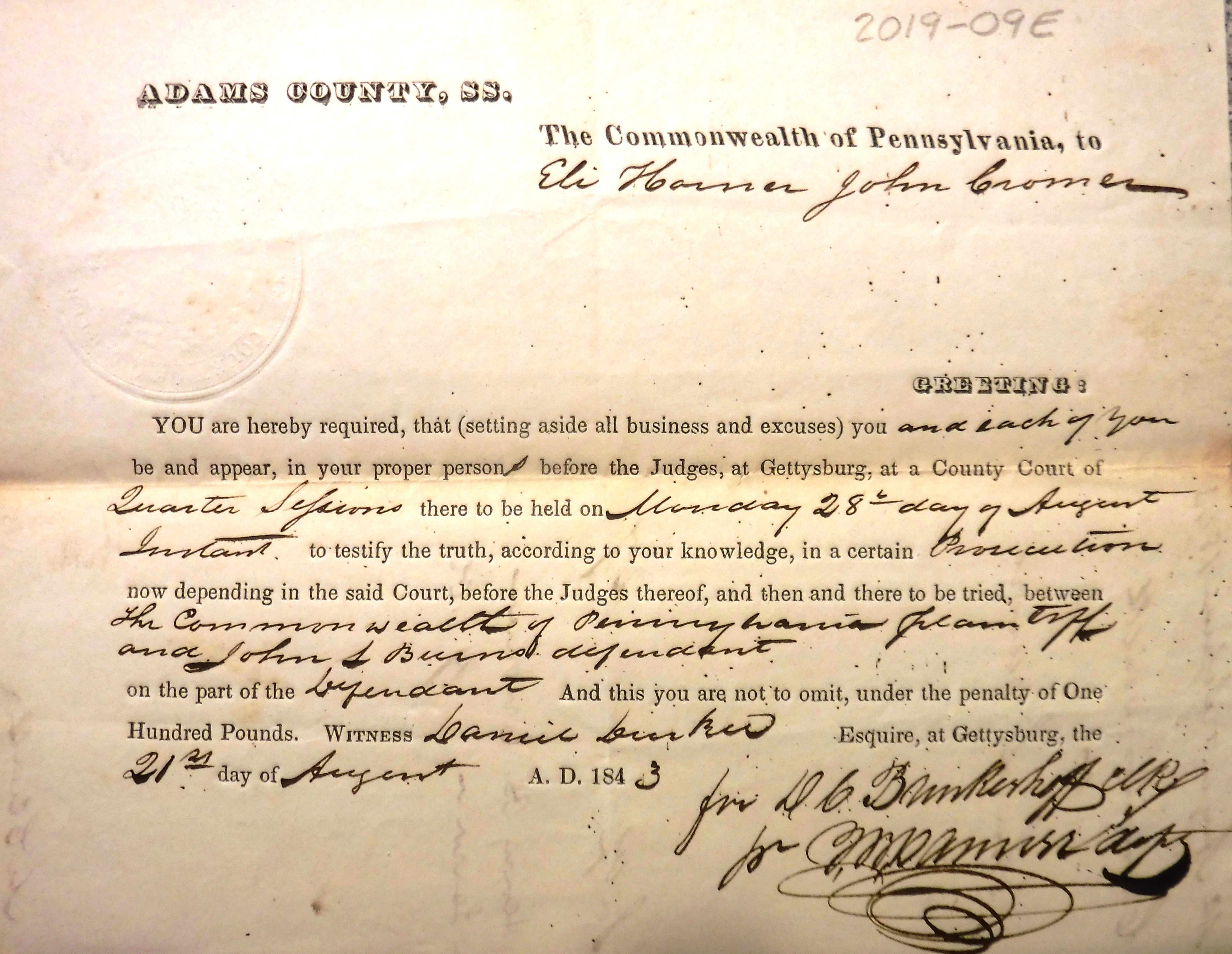 Document 2019-09e: “The Commonwealth of Pennsylvania to Eli Harner, John Cromer…21st day of August, A, D, 1843.” |