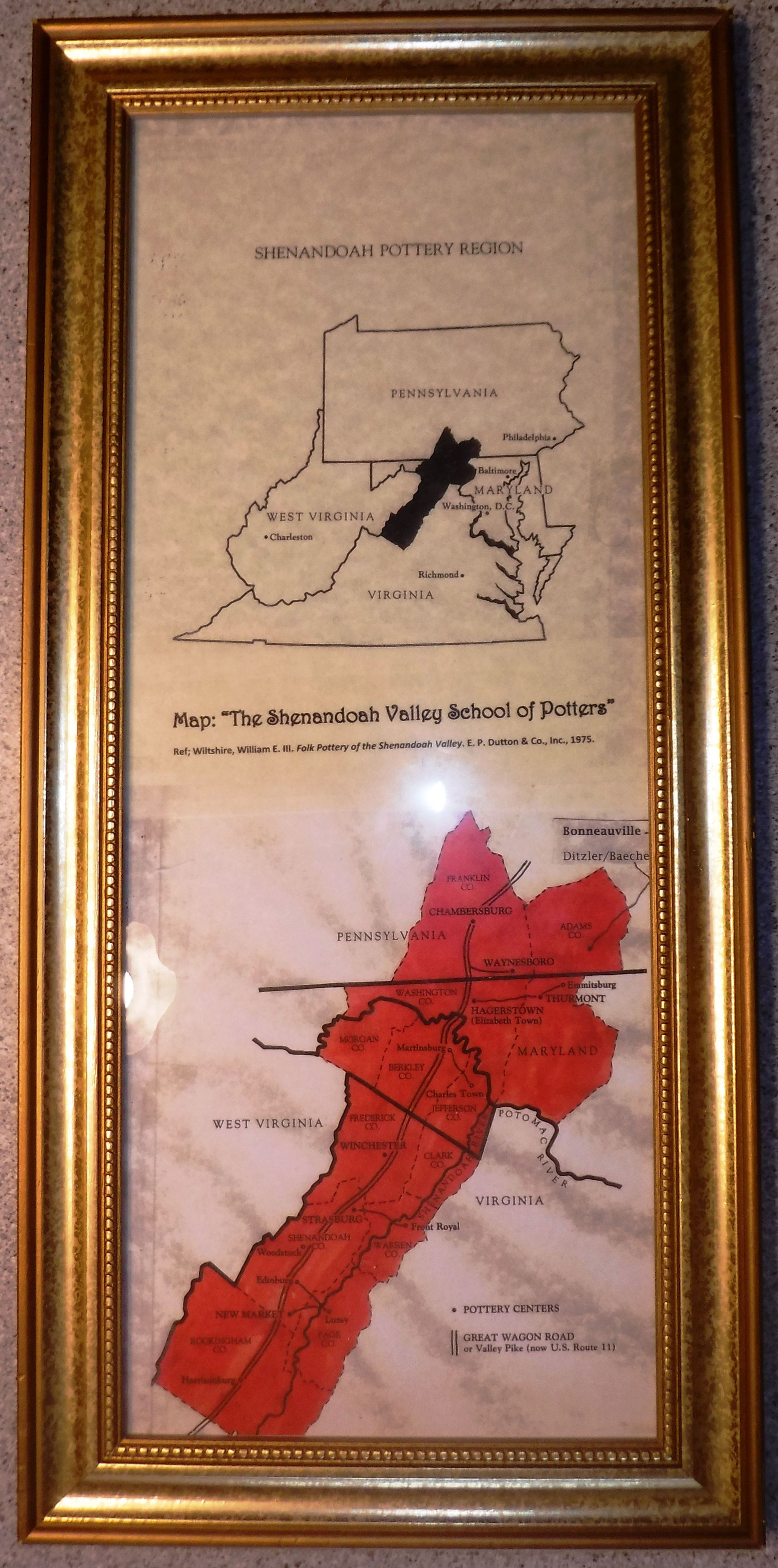 In his book; “Folk Pottery of the Shenandoah Valley” (E. P. Dutton Co., 1975), author William E. Wiltshire III provides a map of the “Shenandoah Pottery Region”. The area includes parts Virginia, Maryland, and Pennsylvania. Wiltshire includes Adams County, PA in his map. Ditzler/Baecher kiln location has since been added.