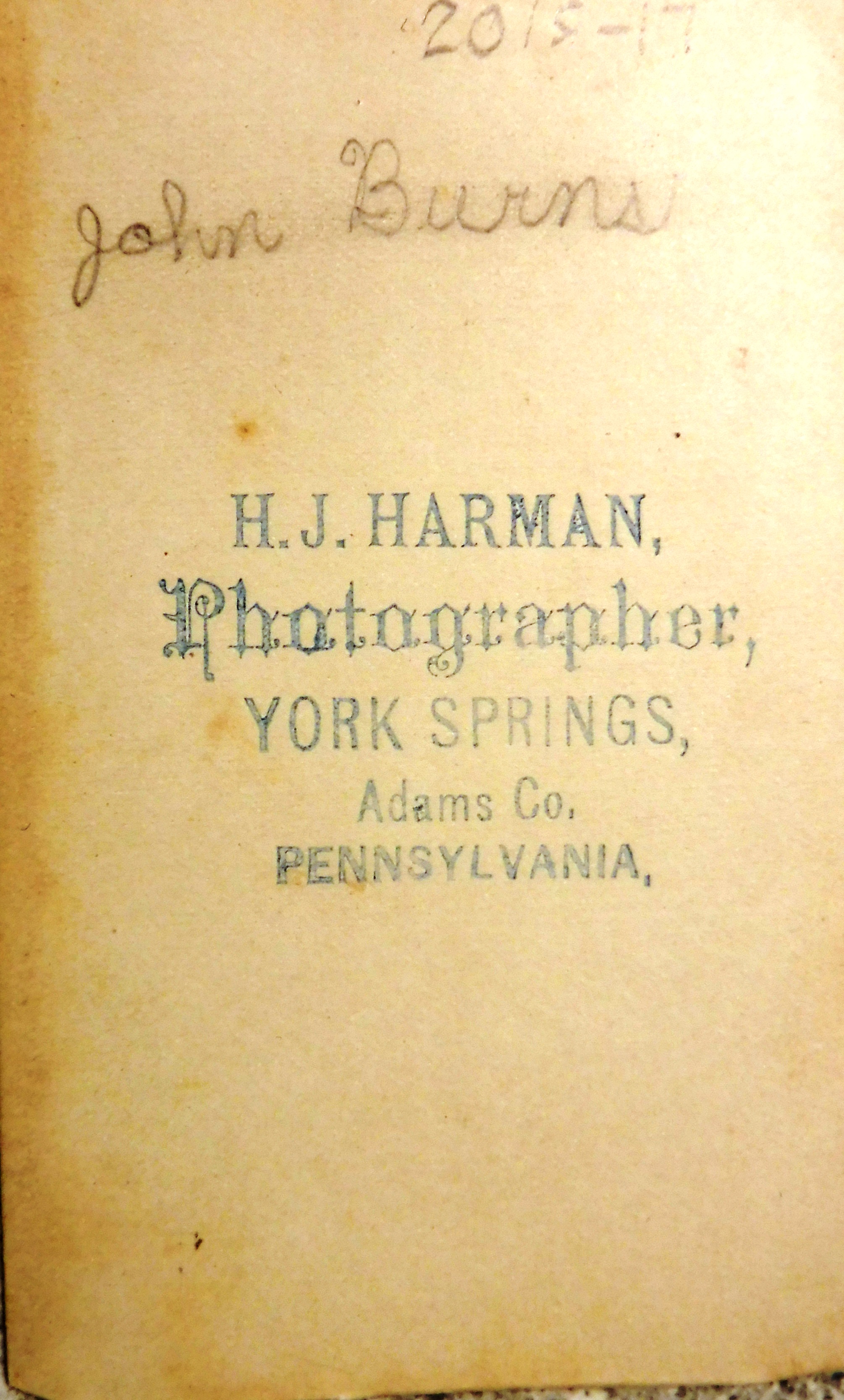 This CDV Photograph was part of a package of eleven similar pictures of other individuals, purchased as a lot at auction. All photos were back-marked: "H. J. Harman, Photographer, York Springs, Adams CO., Pennsylvania." On the back of this photo, handwritten in pencil, is the name "John Burns".