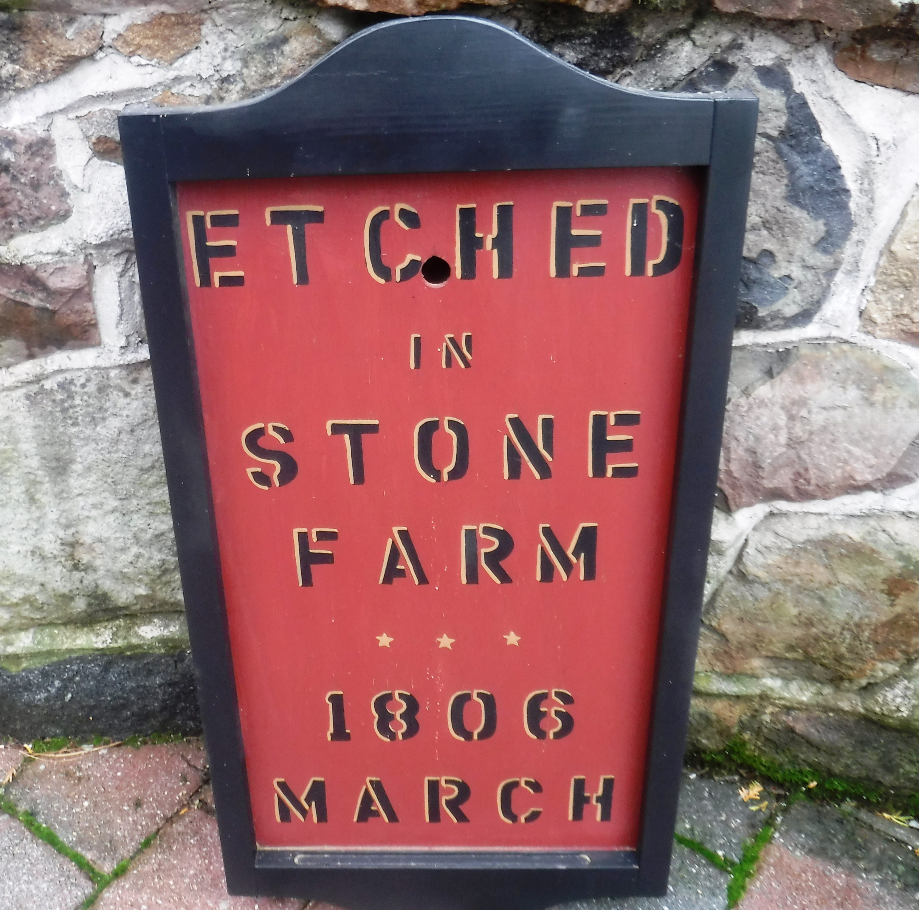 Hickory Drive, from the Bonneauville Catholic War Veterans property, to a point about two miles south, has at least four farms with old two-story farmhouses built from local sandstone. The contents of one such home, located at 1050 Hickory Road, were sold at public sale on 10/19/19. The owners of the home prior to the auction (which had been whittled down to ten acres by that date) chose to name their farm; "The Etched in Stone Farm". This cataloged item is a wooden sign that was painted to display that name.