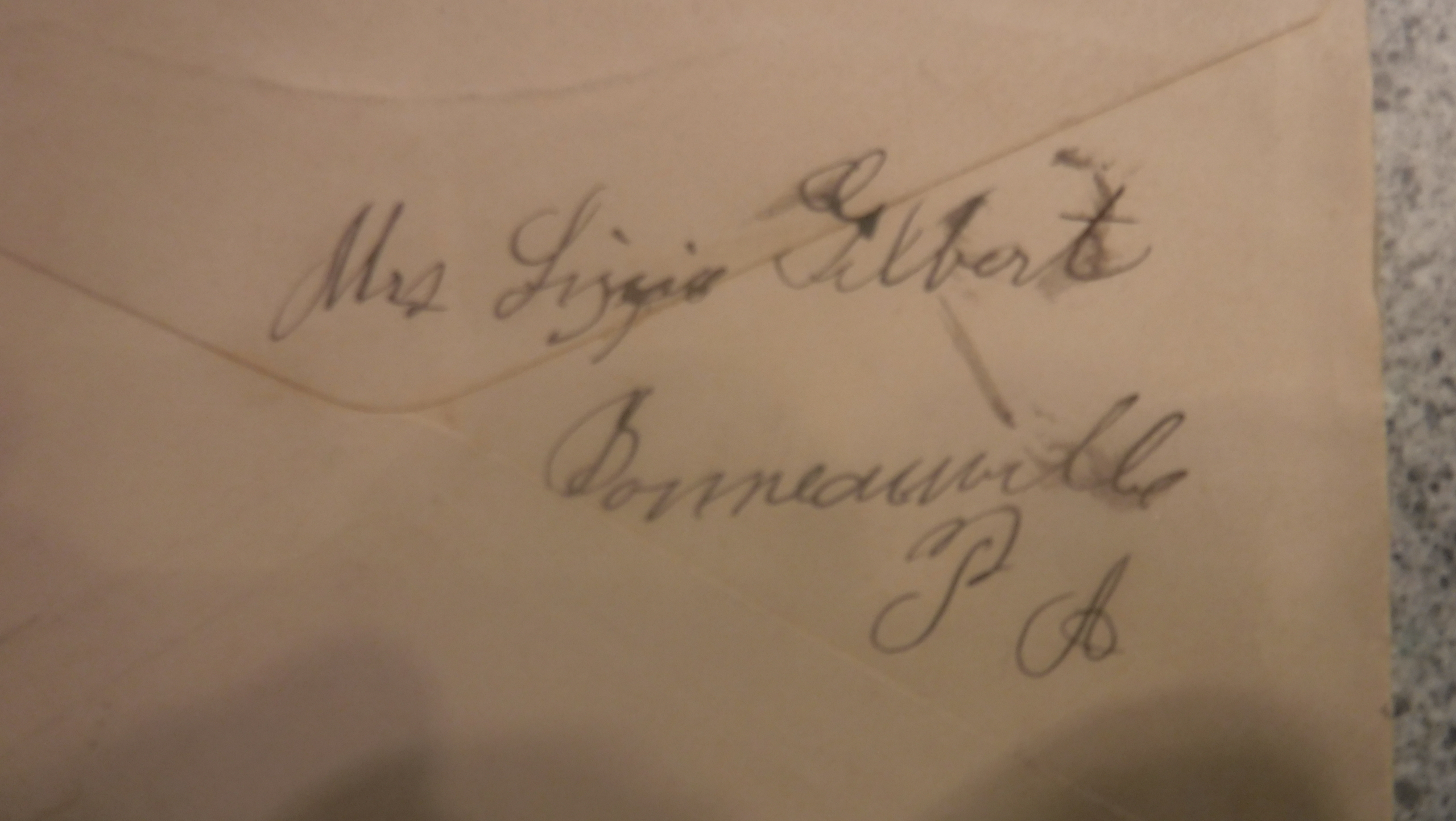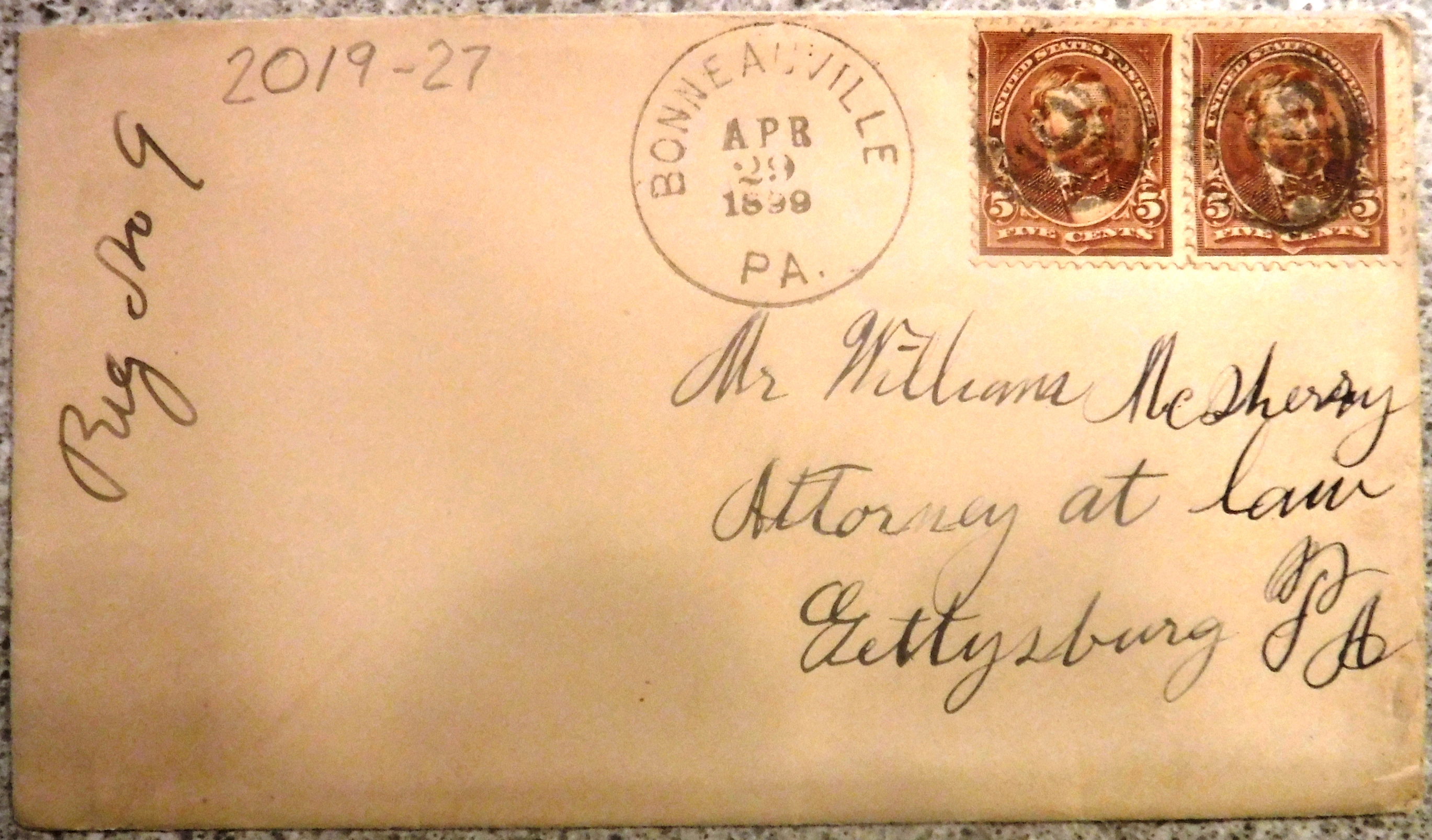 This envalope; postmarked "Bonneauville (Post Office), Apr. 29, 1899," is addressed to Mr. William McSherry, Attourney at Law, Gettysburg, PA. The sender is Mrs. Lizzy Gilbert.