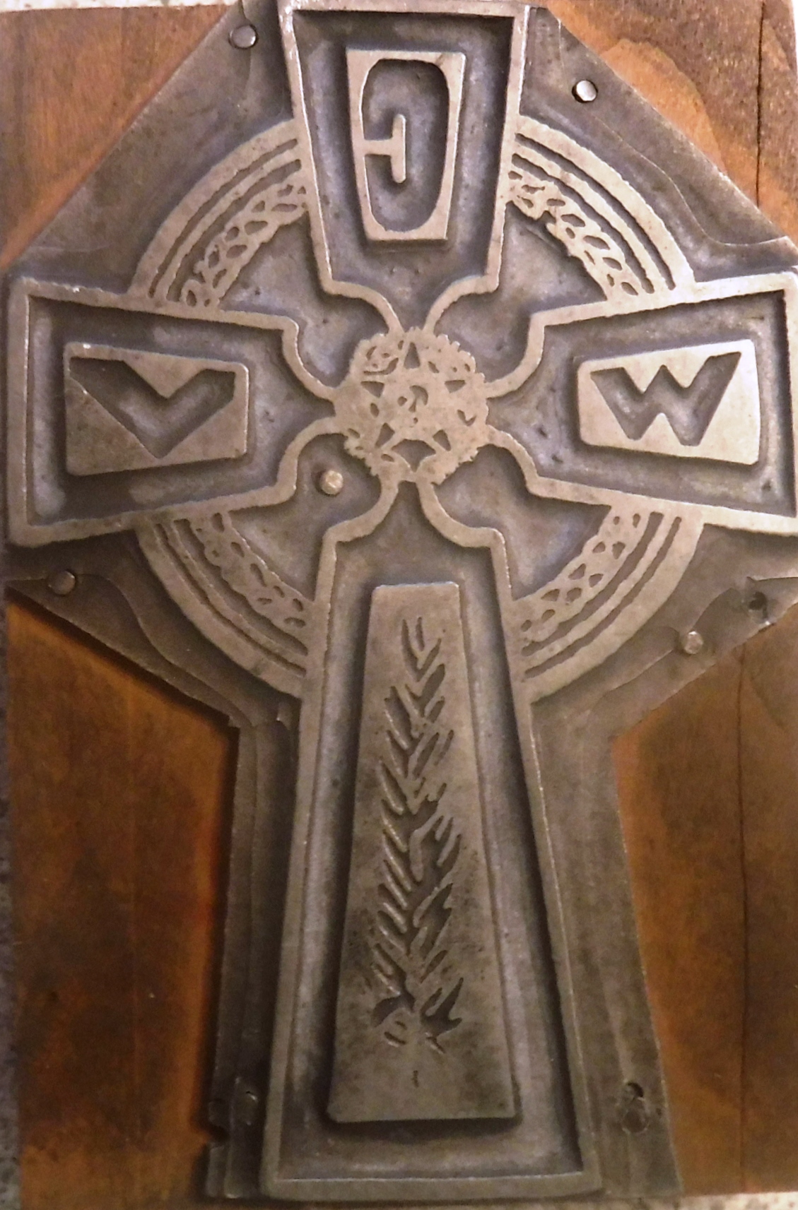 The zinc on wood block was created in the mid-20th Century. (The first C. W. V. group was formed in 1935.) The block is quite worn, especially at the center where a star and "US" would appear. It may have since seen decades of use as a paper weight or in other service. The unusual feature of this block is the four loops that intersect the arms of the cross. The loops are not found on typical CWV organization logos.