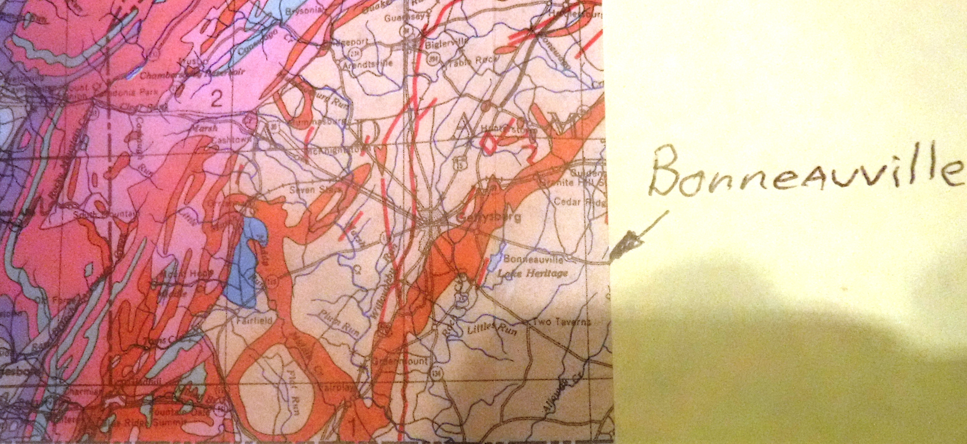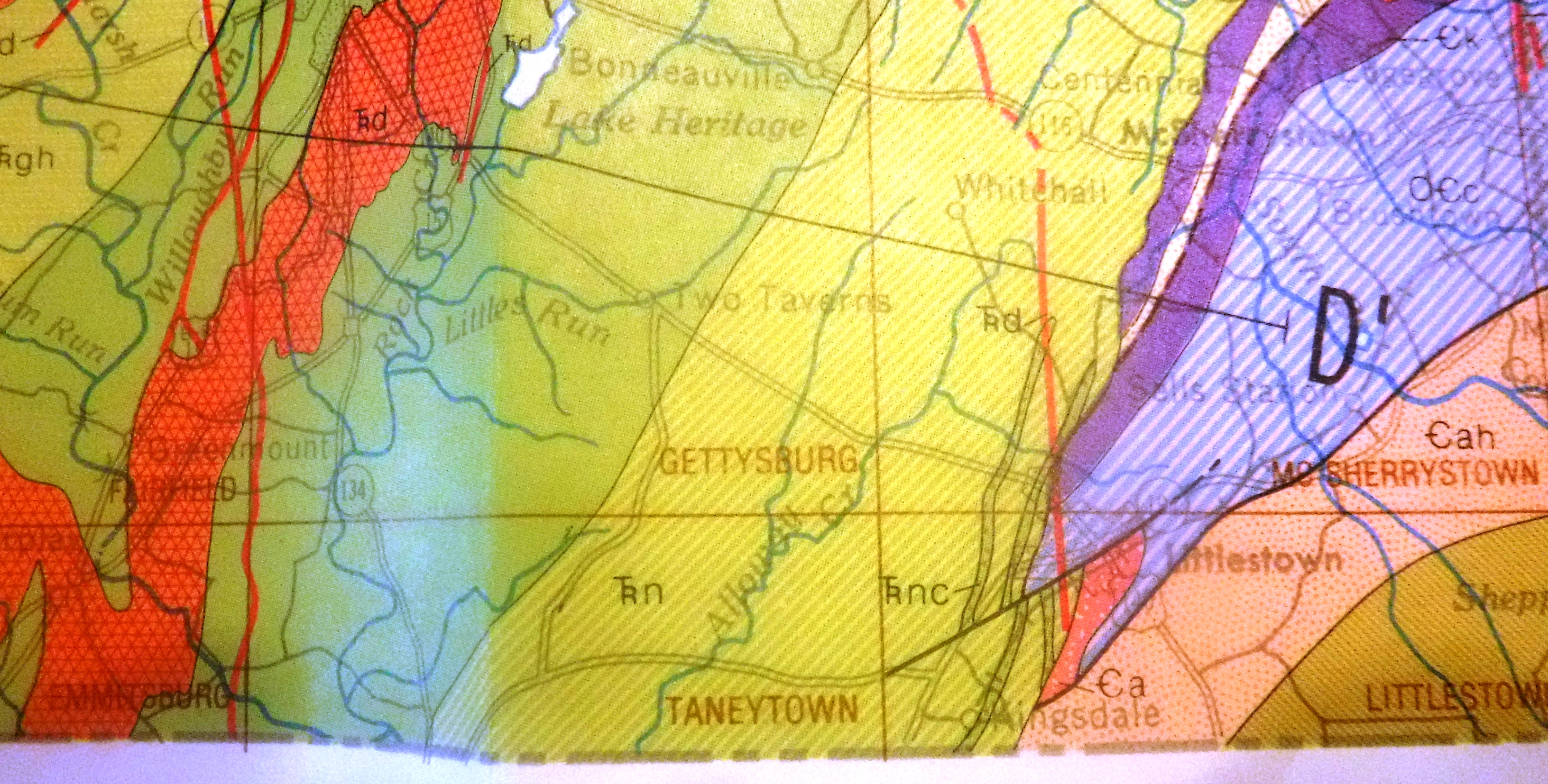 In what appears to be an abstract artistic fashion, the vivid, contrasting splashes of color across this collection of maps denotes the geological evolution in Pennsylvania. Shown are eons of development of the states topography and rock types. The slanted moss green color band on which Bonneauville lies, denotes rather mundane rock makeup when compared to the rest of the state. Eons of volcanic, and plate tectonic activity of neighboring zones throughout Pennsylvania, resulted in tremendous variations in the makeup of the rock foundation of the state.