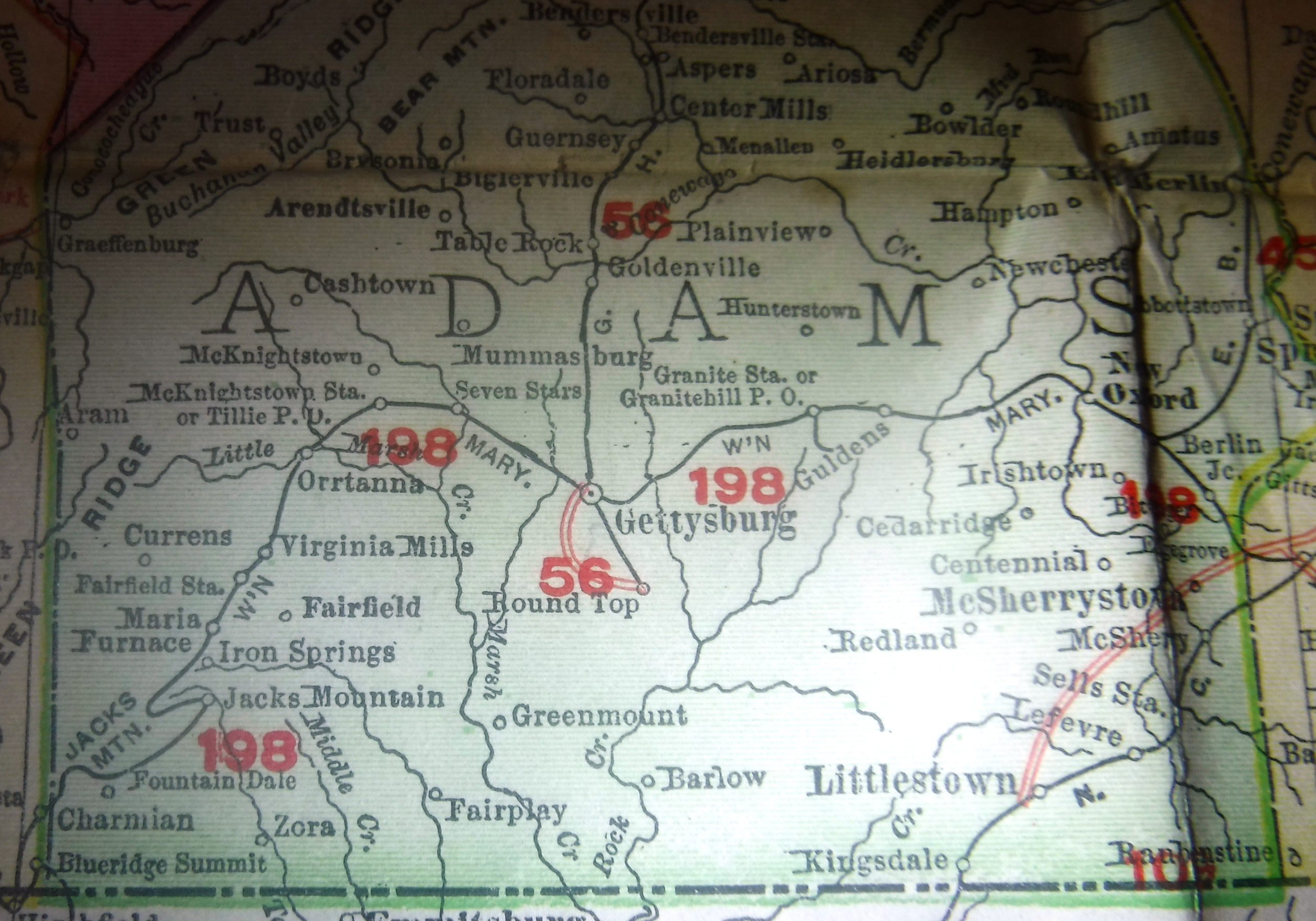 Like most road maps of the early 20th Century, Bonneauville is not located on the fold-out state map. However, Page 23 of the attached booklet lists Bonneauville as being of “Adams County," and "R. D. from Gettysburg.” The town's population in 1909 was listed as 139.