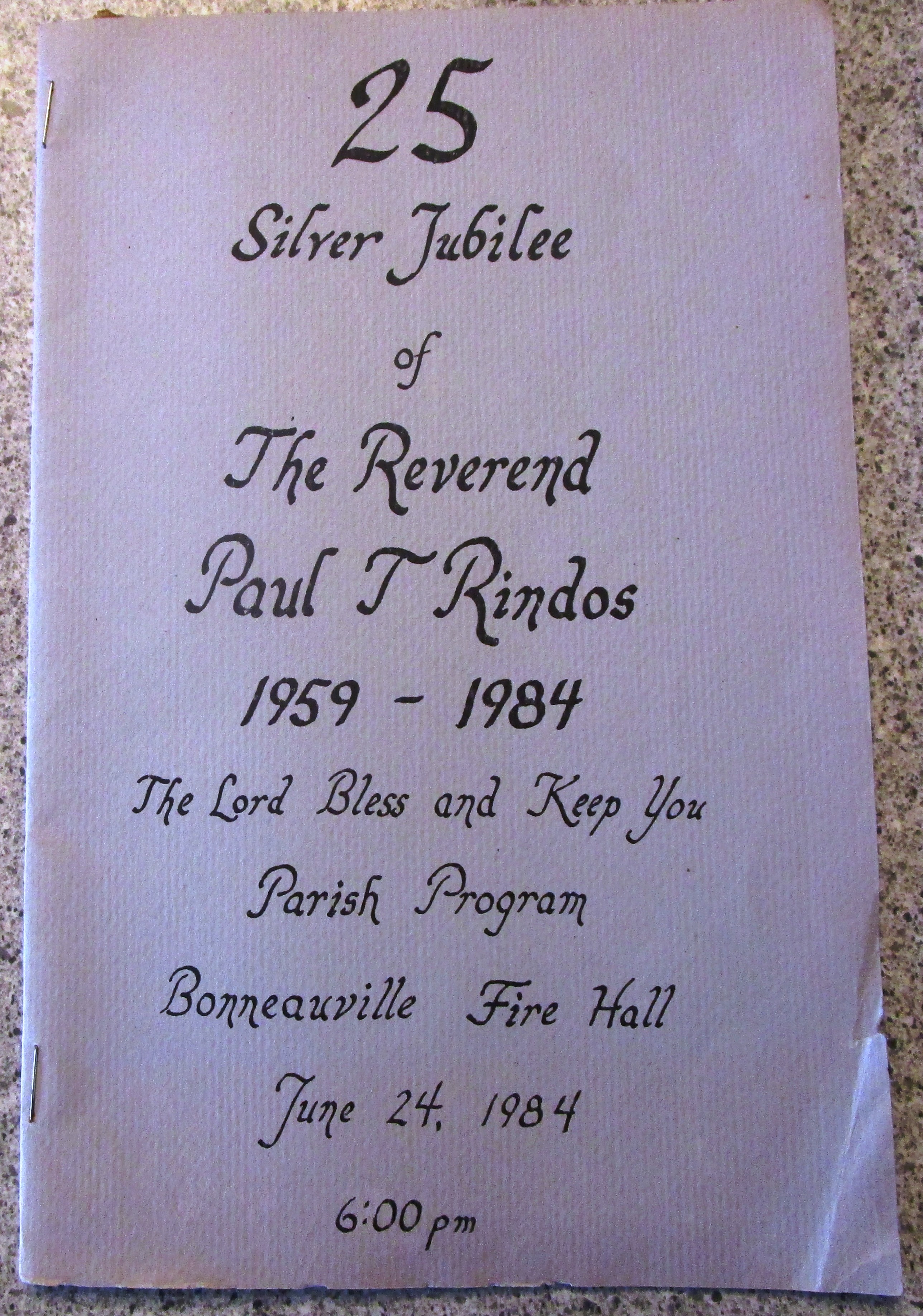 This sixteeen page booklet titled; " 25 Silver Jubilee of The Reverend Paul T. Rindos, 1959 - 1984", was published 1984. "The Lord Bless and Keep You, Parrish Program, Bonneauville Fire Hall, June 24, 1984, 6:00 P.M."