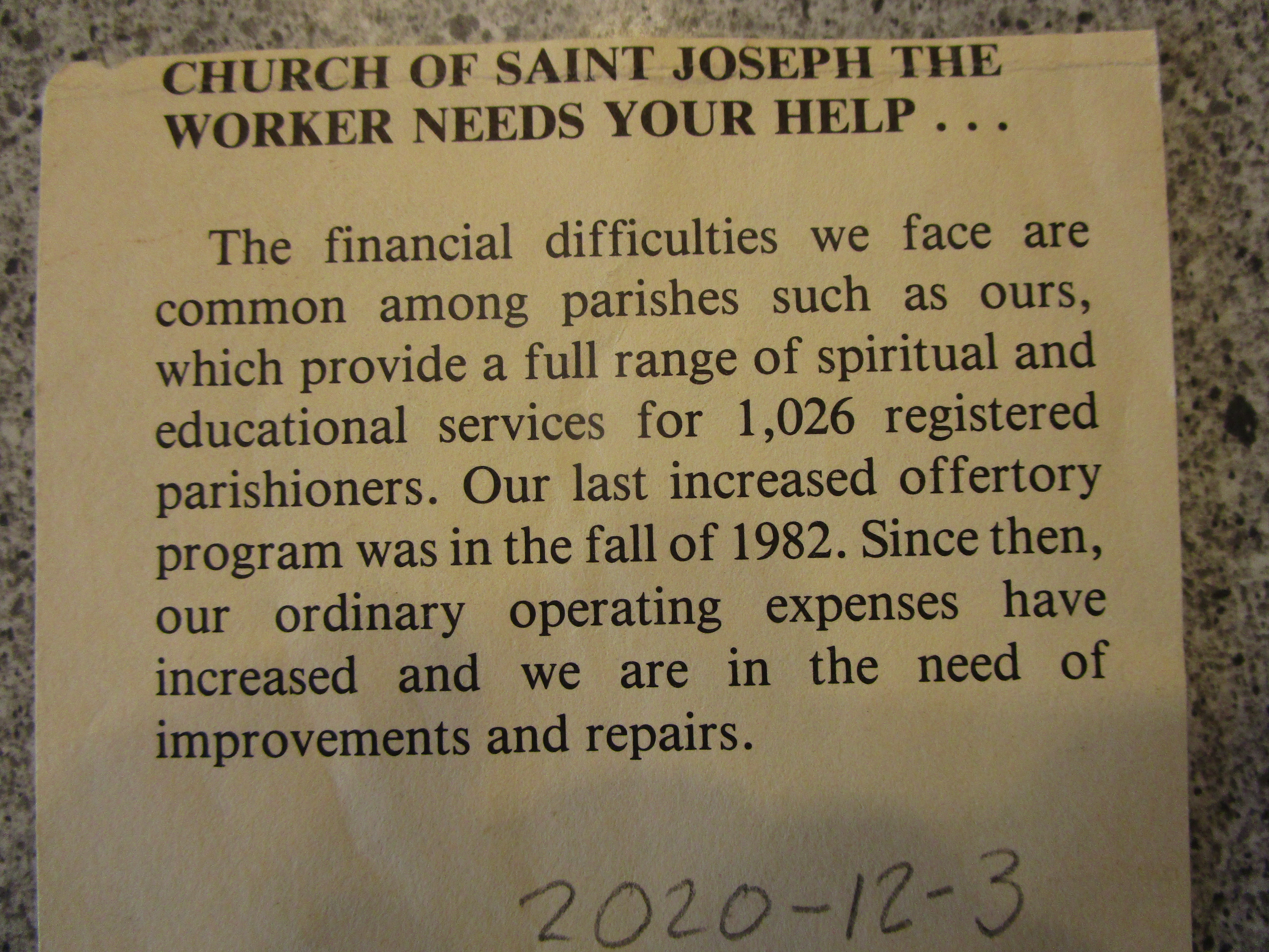 This 3" x 3 1/2" photograph of St. Joseph's Church, Bonneauville, contains the following text on the reverse, in its entirety: "Church of Saint Joseph The Worker Needs Your Help." "The financial difficulties we face are common among parrishes such as ours, which provide a full range of spiritual and educational services for 1,026 registered paritioners. Our last increased oferatory program was in the fall of 1982. Since then our ordinary operating expenses have increased and we are in the need of improvements and repairs."