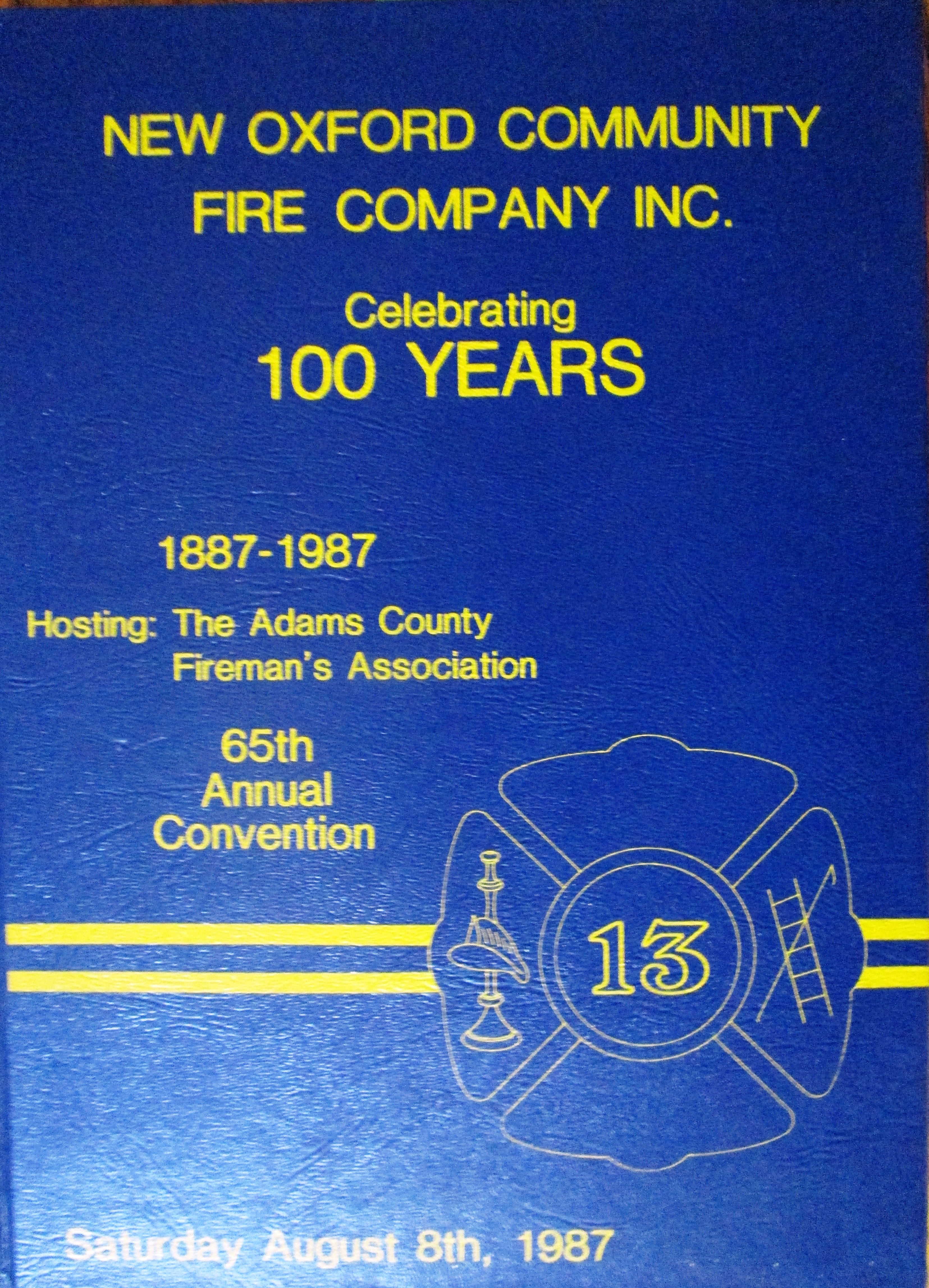 "New Oxford Community Fire Company Inc., Celebrating 100 Years", 1887 - 1987. "Hosting:The Adams County Firemans Association 65th Annual Convention, Saturday, August 8th, 1987."