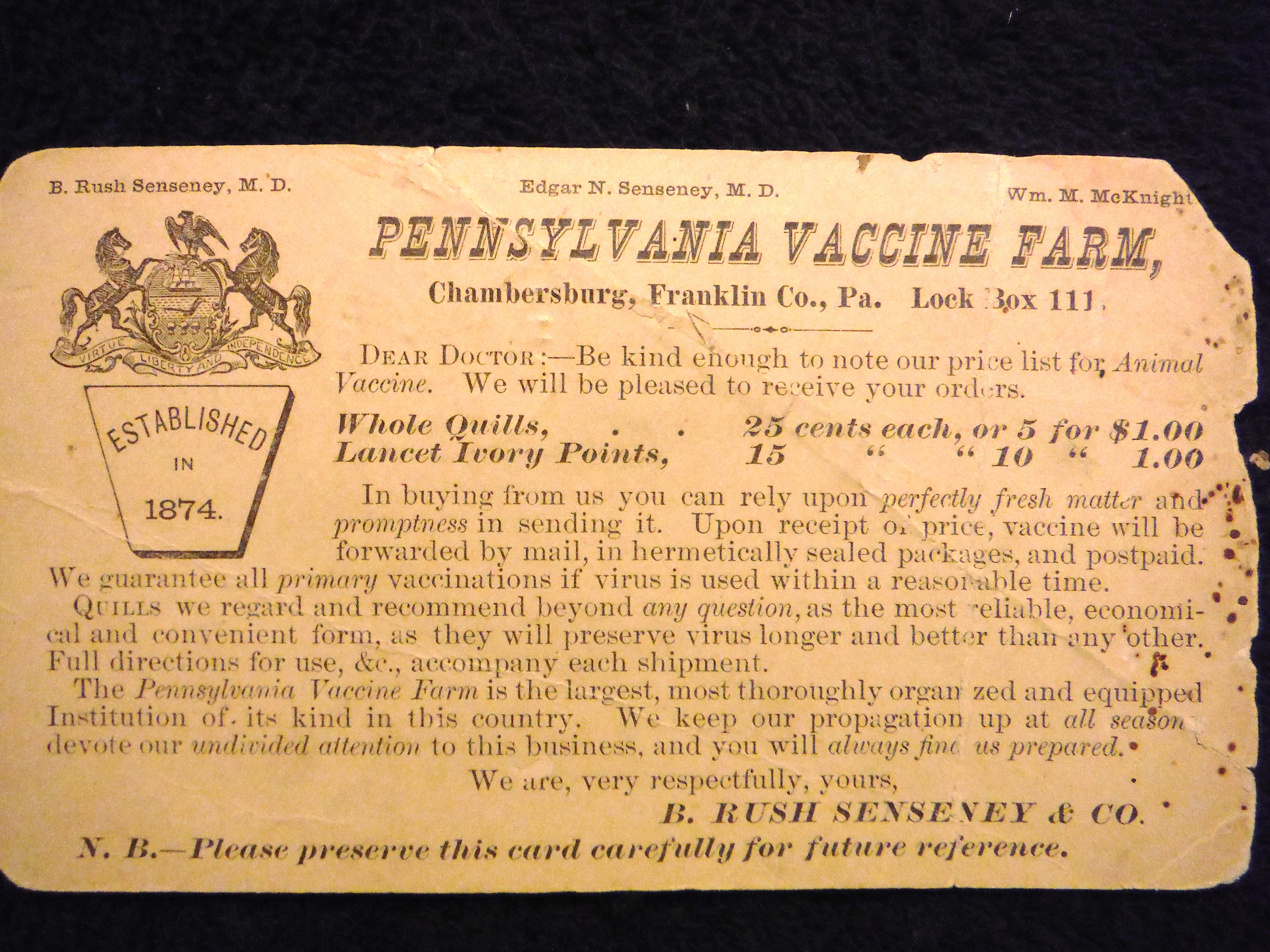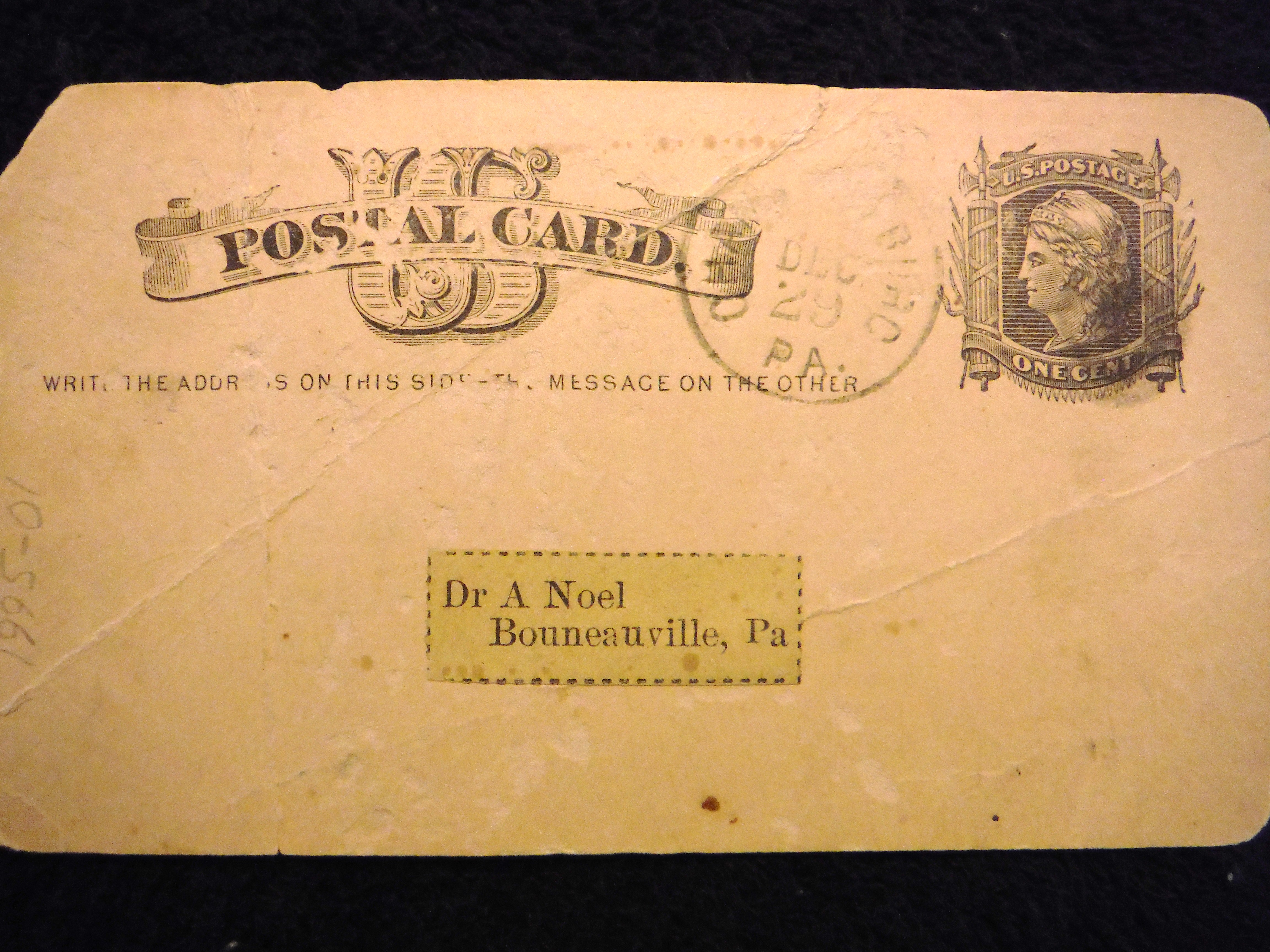 Doctor Agideous Noel attended medical school in New Oxford, PA and served as a surgeon during the Civil War. He returned home to Bonneauville and served the community as a medical doctor. His home and office were located at 26 E. Hanover St. This card was sent from the Pennsylvania Vaccine Farm in Chambersburg, Pa.