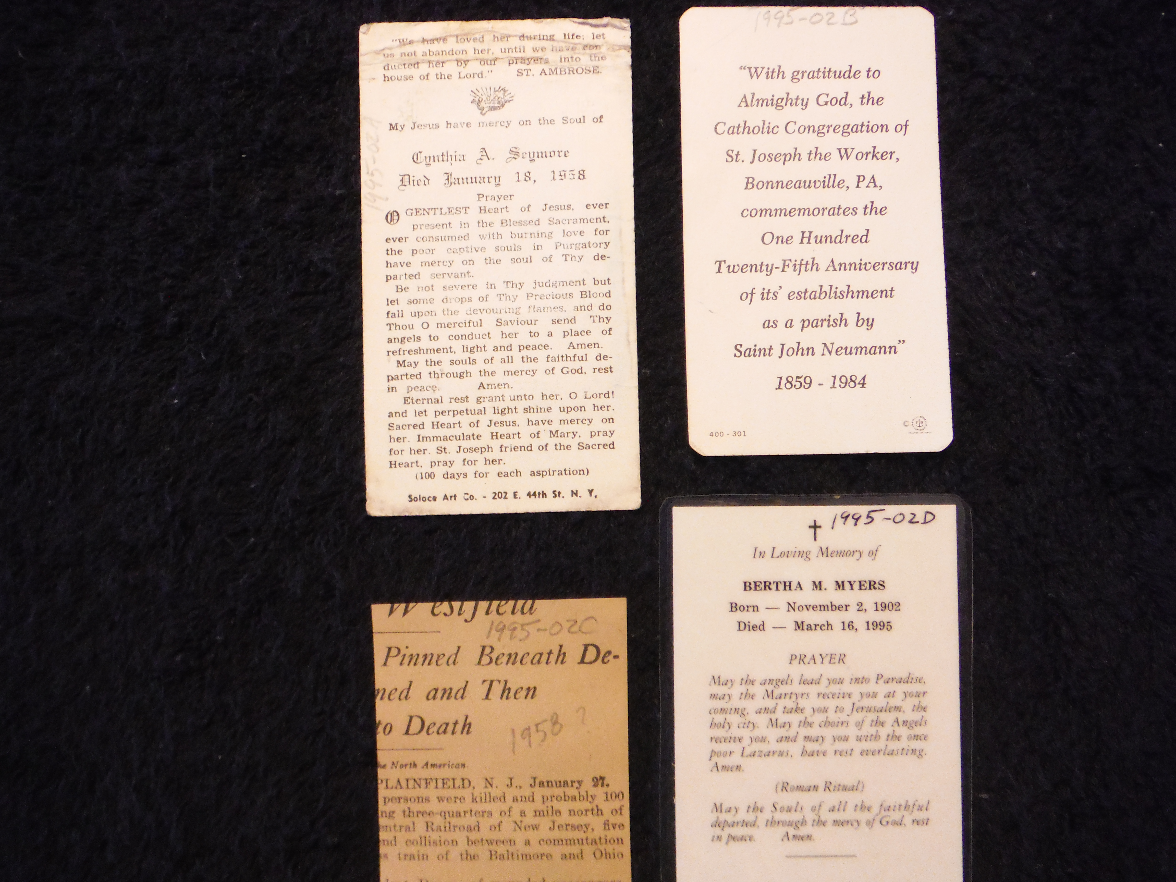 1995-02B Prayer Card - Cynthia Seymore, Bonneauville, PA. (Daughter of Sylvester and Henrietta Seymore). Obverse; Our Lady of Perpetual Help. Reverse; "Cynthia A. Seymore, died January 18, 1958."
