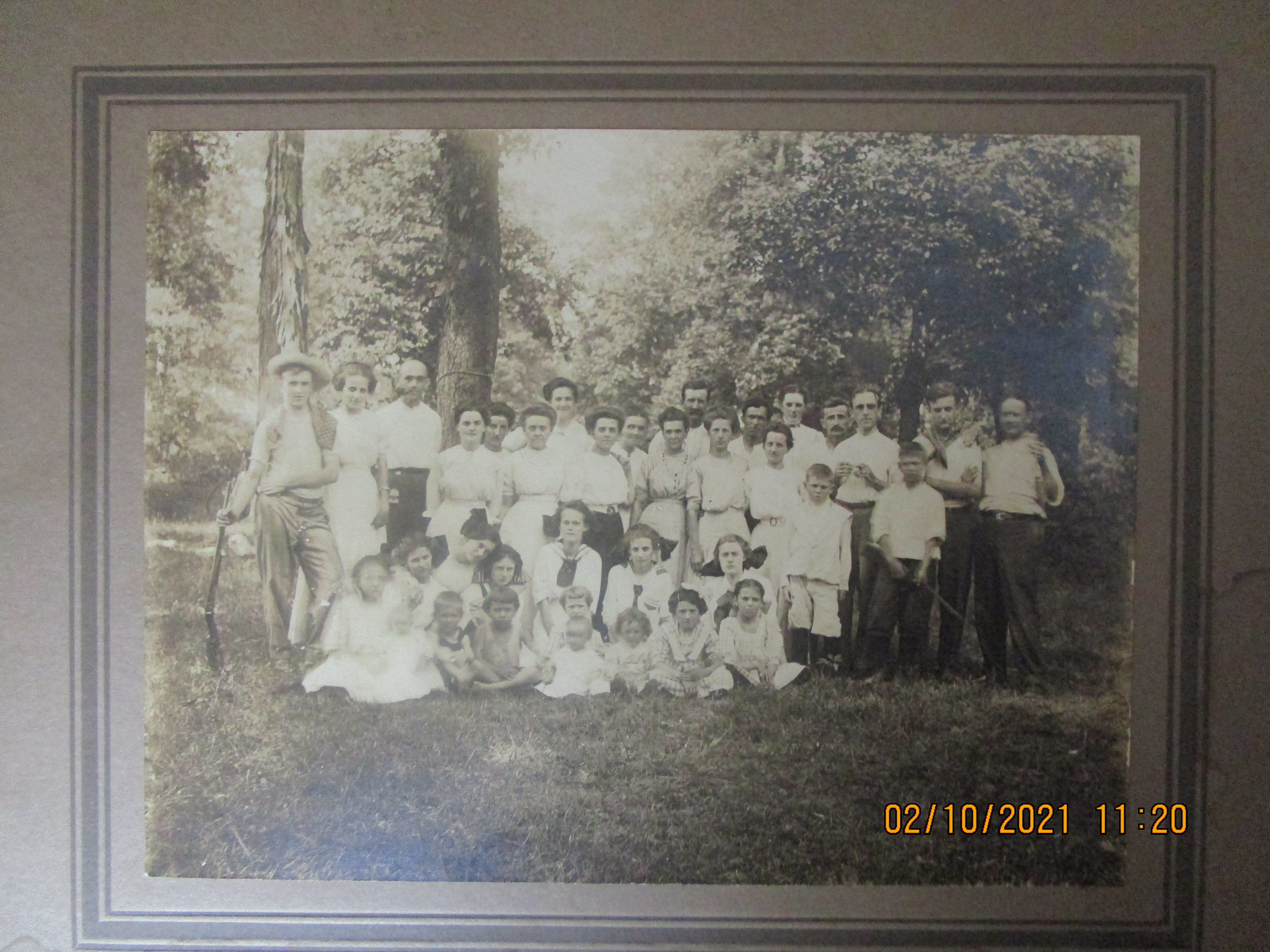 The group of 36 individuals is eclectic. At least two have brought guns to the get-together as if perhaps, squirrel might be on the day's menu. More likely they were brought to fire a few shots in celebration of the Fourth. There appear to be no elderly in the group. The ratio of adults to children seems small. The ladies are all neatly dressed, wearing characteristic hair fashions of the day.