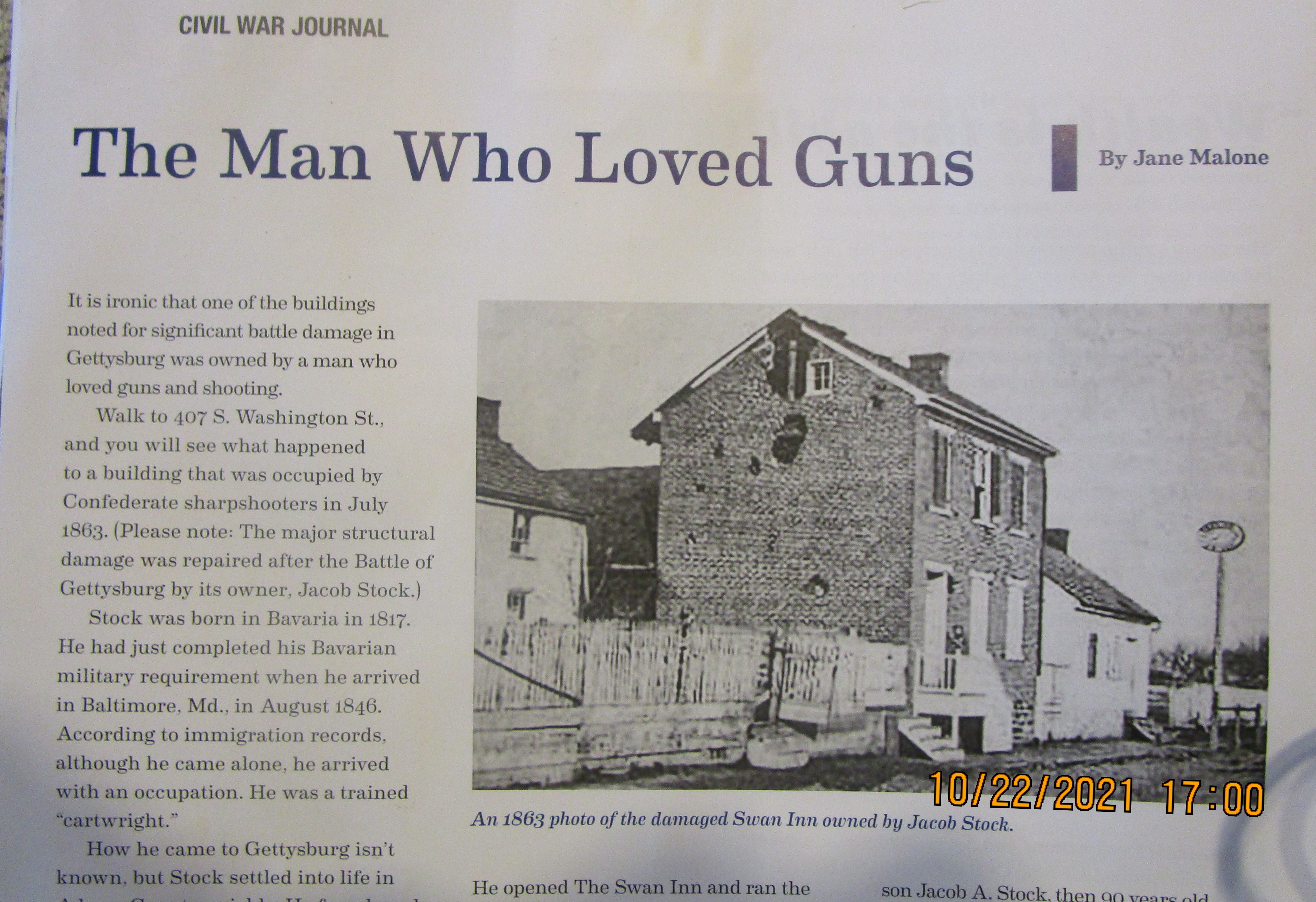 This article was written by Jane Malone. It gives a brief but interesting history of immigrant inn owner Jacob Stock of Gettysburg, PA.