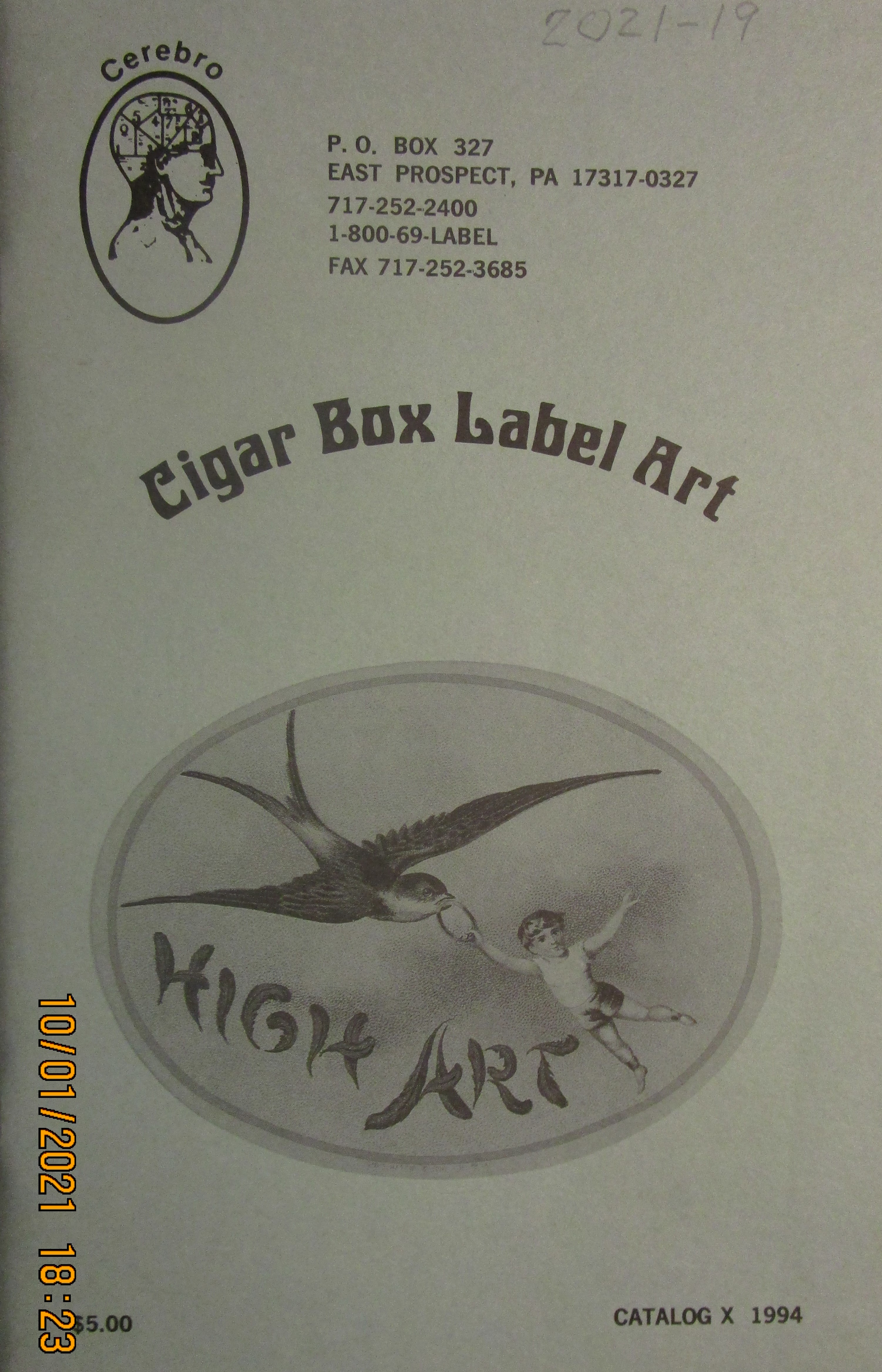 This catalog contains the following text on the cover "Cerebro, P. O. Box 327, East Prospect, Pa ... Cigar Box Label Art, High Art, $3.00, Catalog X, 1994".