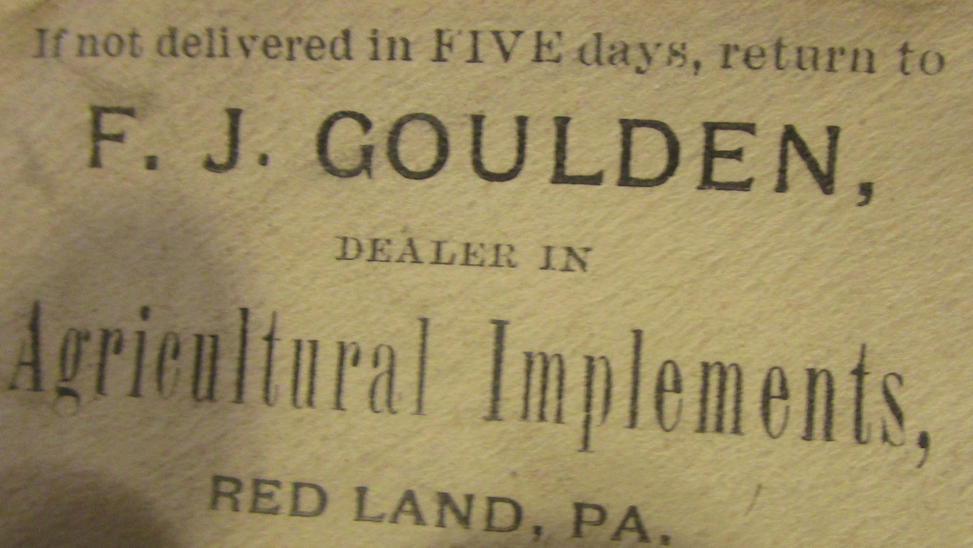 "If not delivered in FIVE days, return to; F. J. GOULDEN, dealers in, Agricultural Implements, Red Land, PA."