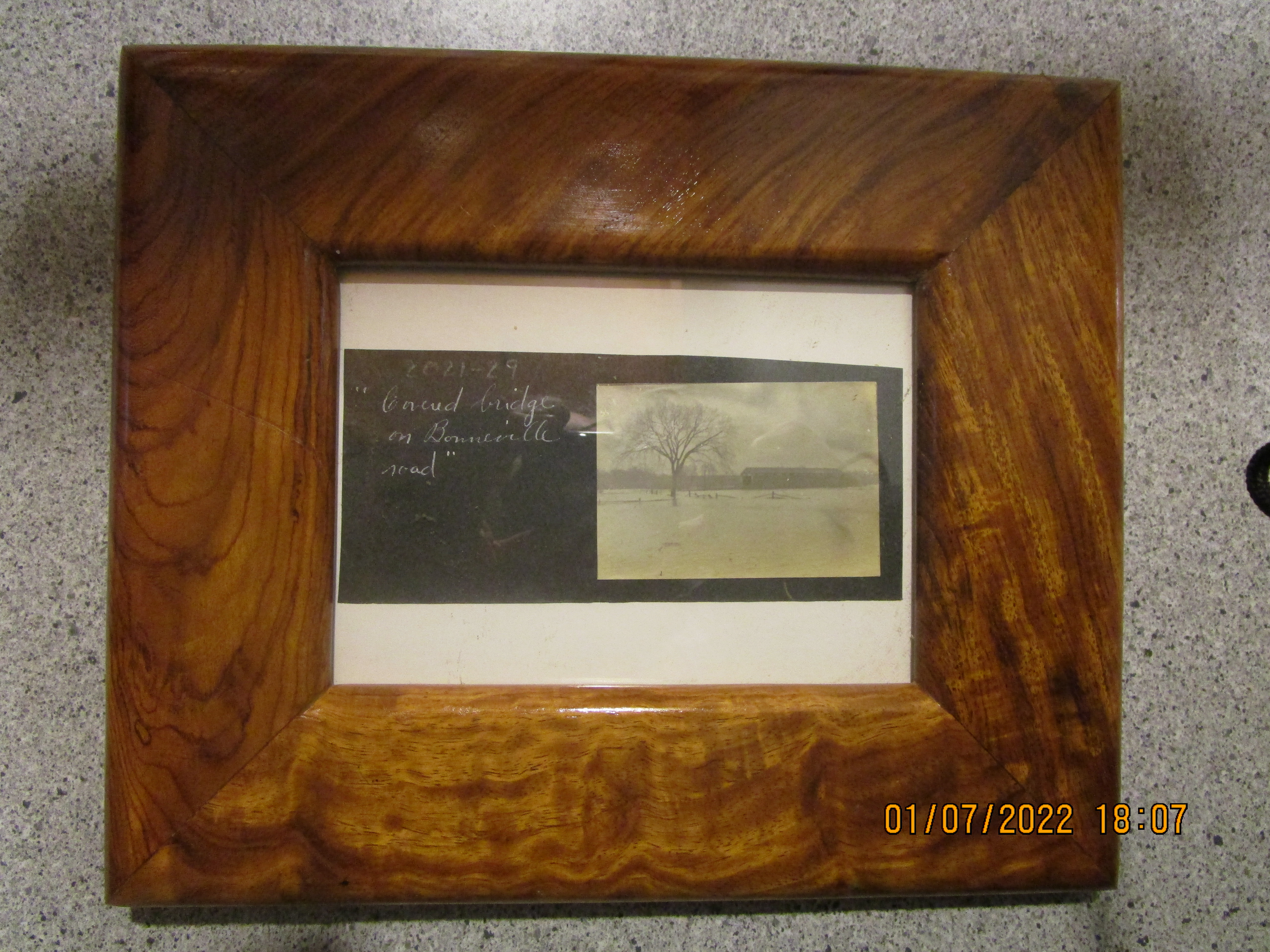 This photograph and accompanying notation were clipped from an old, unidentified scrap book/photo album. The text, (white script on black paper) states: "Covered bridge on Bonneauville Road".