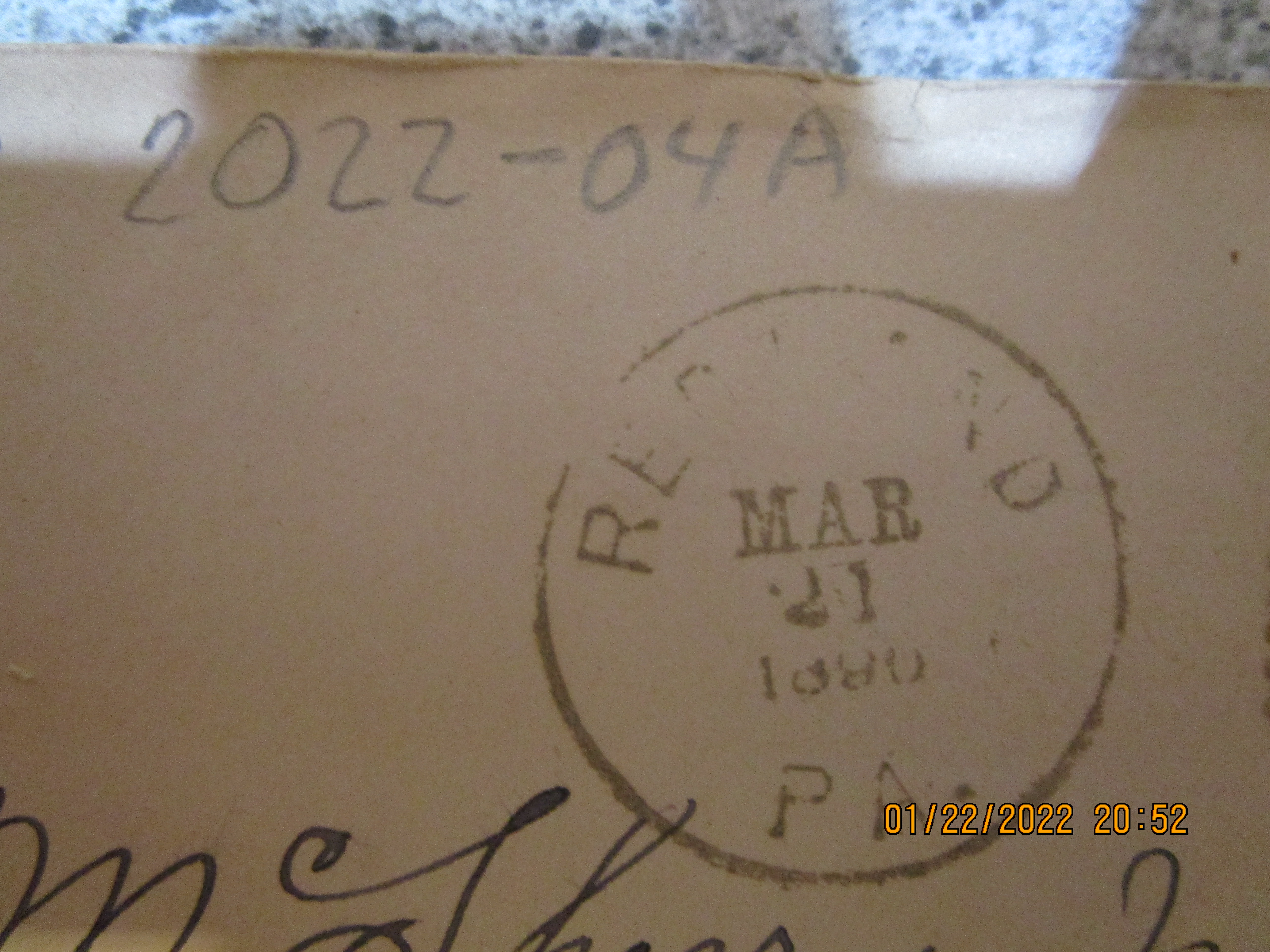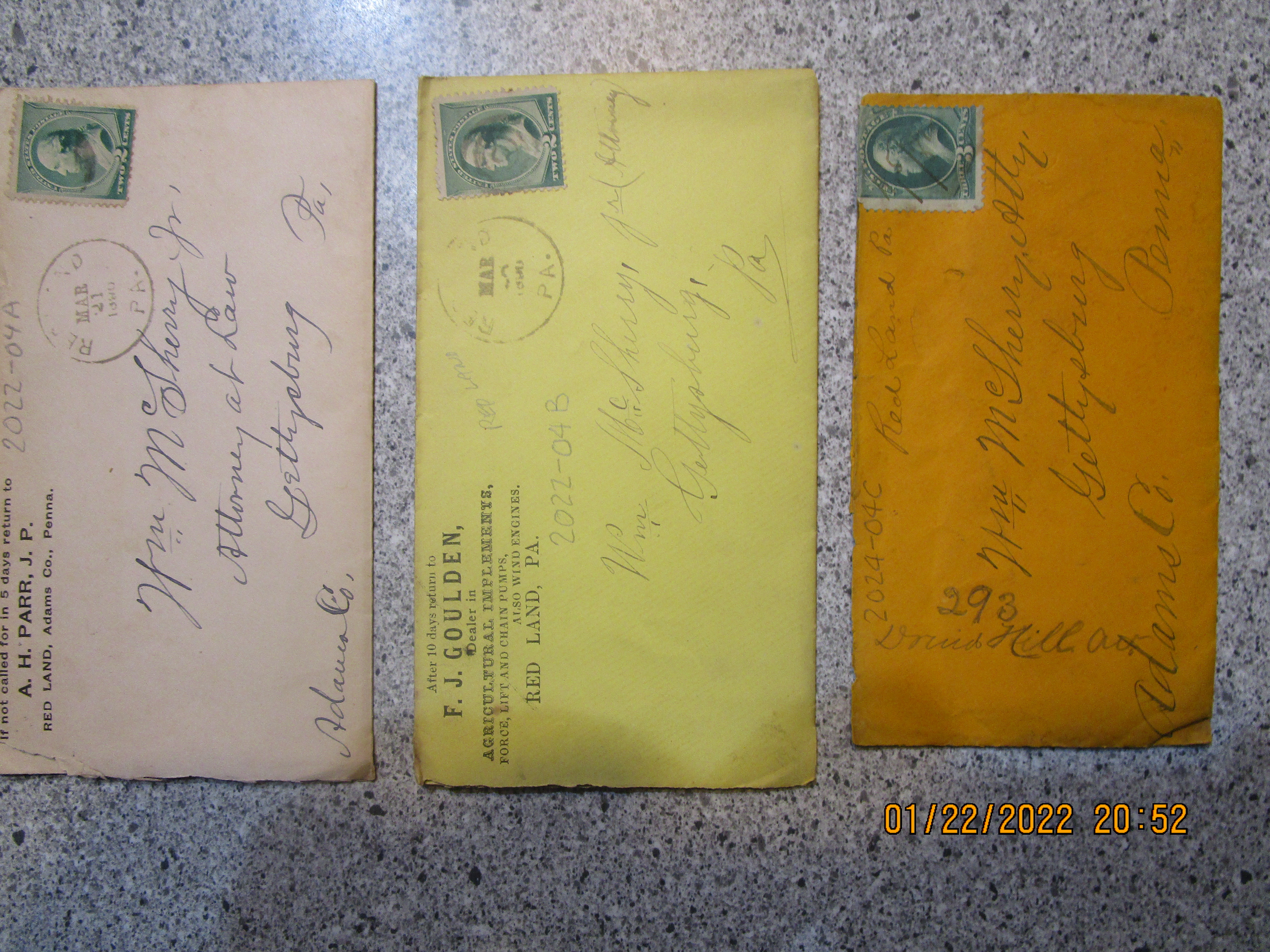 In the late 1800's one of Bonneauville's closest small town neighbors was Whitehall, PA. The boom town was also known as Red Land, as indicated on White Hall's post office's postal cancellation stamp. All three of these pieces of mail were addressed to sendee Atty. McSherry of Gettysburg PA. Senders were: