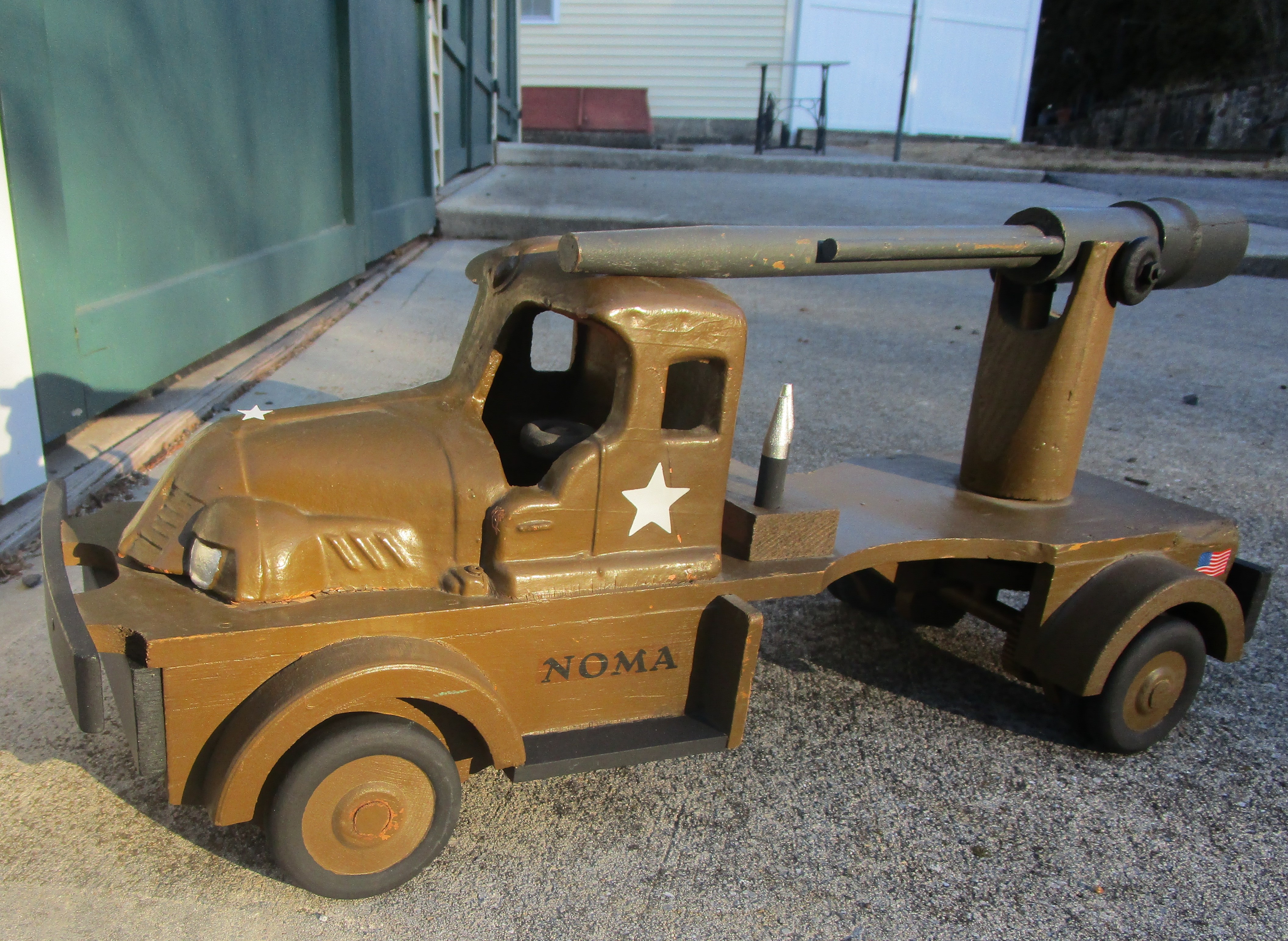 This toy rocket launcher truck, a representation more akin to a WWI style military vehicle, is a rarity. It was commercially fabricated using wood and composite fiberboard. The materials were far more fragile than the durable pressed steel models produced before and after the war. Many crumpled at the harsh use by sandbox warriors. Others were quickly reduced to pulp when left outside in the elements. The remaining few exist as a reminder of improvisions driven by the harsh times that existed during the WWII years.