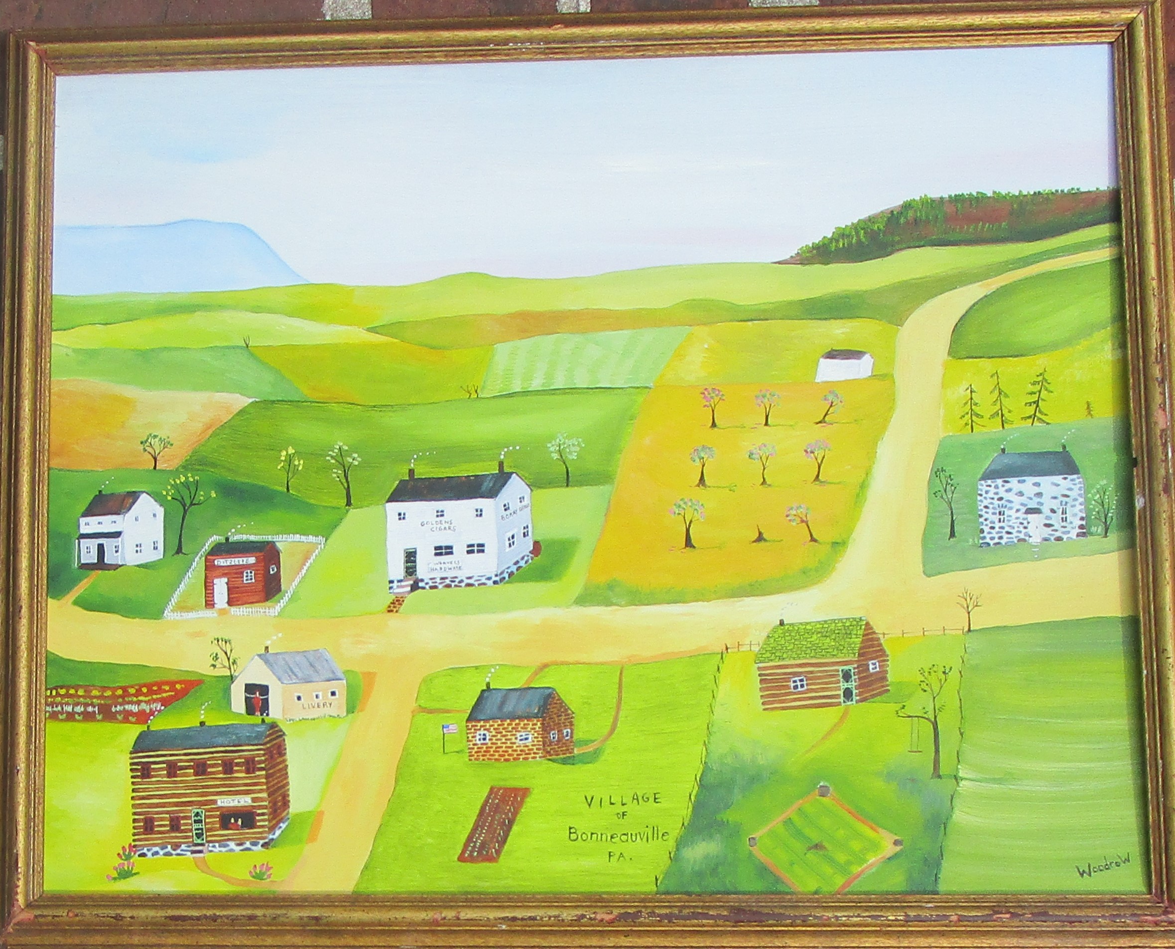 This Nancy Woodrow folk art painting is a whimsical and warm spirited attempt to show Bonneauville in an earlier, simpler time. The overall view is from the village square facing northward. Bisecting the view horizontally is Hanover Street (Route 116, the Hanover Road.) Upper right going approximately north is Pine Street (The Bonox Road). The street at bottom left heading south (towards the bottom of the picture) is Maple Street. For one block it represents the conjoined routes from Hunterstown to Littlestown (and on to Baltimore), and the road from New Oxford to Two Taverns. These were the town’s first two roads.