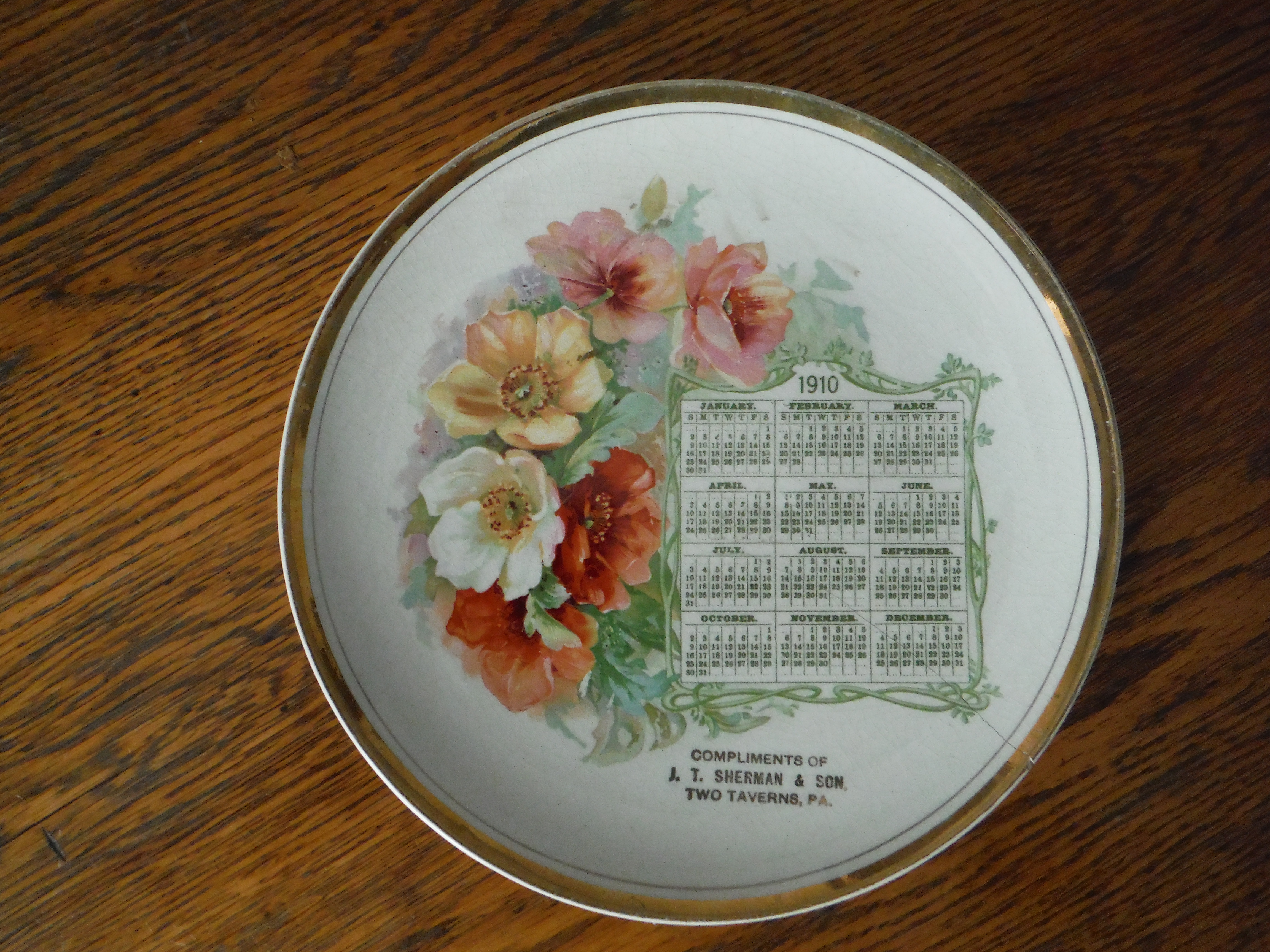 8 ½" diameter, gold banded Calendar advertising plate. "Complements of J. T. Sherman and Son, Two Taverns, PA." Floral decoration. Stamped "Dresden China" on back.